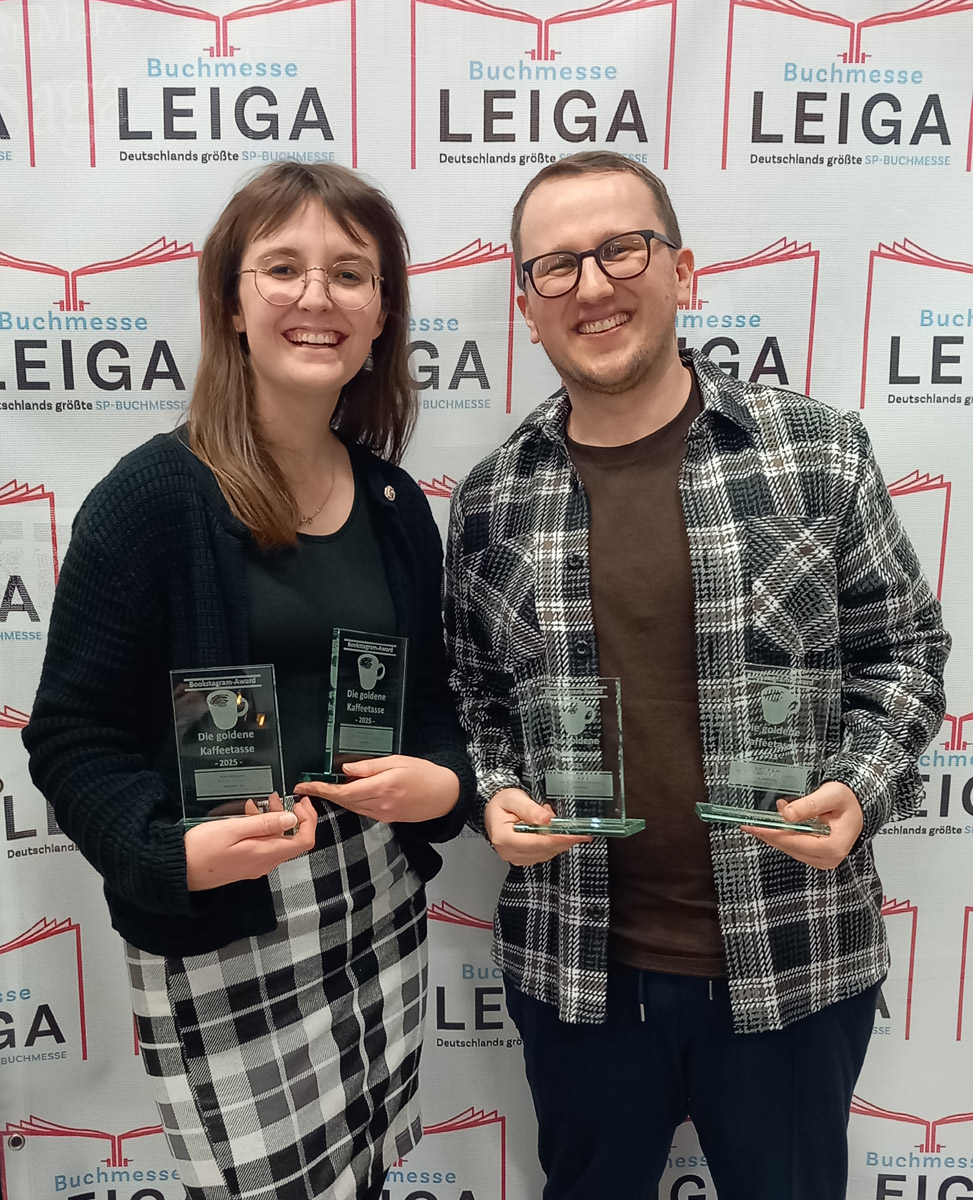 Nach der Leipziger Buchmesse stand nur eine Woche später die Buchmesse LEIGA in Leingarten auf dem Programm. Auf Deutschlands größter Selfpublisher-Buchmesse konnte man zahlreiche Autoren/Autorinnen treffen, welche – wie der Name bereits sagt – selbst für die Veröffentlichung ihres Buches verantwortlich sind. Auf dieser Messe wurden außerdem die Bookstagram-Awards „Die goldene Kaffeetasse 2025“ verliehen. Insgesamt wurden diese Awards in neun Kategorien vergeben und auf der Bühne wurden die jeweiligen Gewinner/Gewinnerin verkündet. Mirco hatte Alinas Bücherwelt für vier Kategorien aufstellen lassen, um möglicherweise einen von Alinas Träumen zu erfüllen – ihren ersten Pokal zu gewinnen. Und dann war es so weit. Insgesamt vier Mal konnte Alina den Bookstagram-Award „Die goldene Kaffeetasse 2025“ entgegennehmen. In folgenden Kategorien konnte Sie auf dem Support ihrer treuen Community vertrauen: