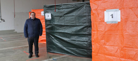 Bürgermeister Thomas Söder in einer Teststation. Bewusst wurde auf eine Abtrennung zu den Nachbarkabinen gesetzt, um ein wenig Privatsphäre während der Abnahme der Probe zu ermöglichen.