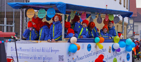 Ein lokales Thema auf dem Faschingswagen? Nicht einfach nur Party, laute Musik und Feiern? Ja, das geht! Zum Beispiel bei der Concordia Hallstadt. „Das Paul-Maar-Museum bekommt ein ganzes Haus, die Maurer- und Bauhandwerkerzunft muss aus der Fischergasse raus“ war an der Seite des Wagens zu lesen. Klar, alles hat immer seine Vor- und Nachteile. Aber die Concordia hatte gleich noch Ideen. Wenn es schon ein Museum mit dem Sams gibt, dann taugen vielleicht die Wunschpunkte für die ein oder andere Idee. Pünktliche DB? Fahrradwege? CO2-Wegputz-Maschine? Was sich nicht so alles mit den Wunschpunkten Gutes anstellen ließe …