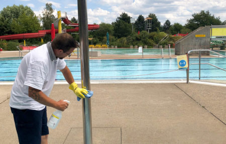 Die Freibadsaison 2020 brachte einige Änderungen mit sich. So desinfizierten unserer Kollegen beispielsweise immer wieder Duschknöpfe, Handläufe und vieles mehr.