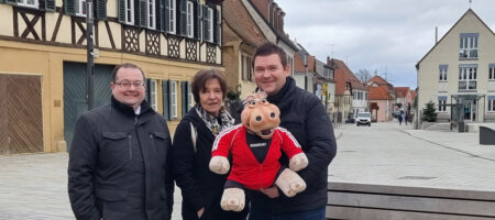 Im Titelbild: Bürgermeister Thomas Söder, Gaby Heyder und Sebstian Reich mit Amanda besichtigen schon einmal den Marktplatz.