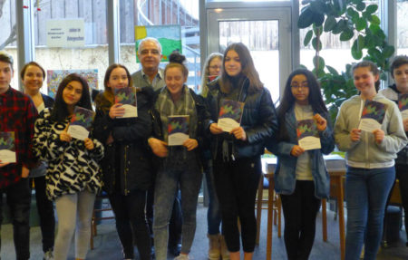 Gruppenbild nach der Lesung mit allen Schülerinnen und Schülern, die einen Text geschrieben haben, Nevfel Cumart und Charlotte Flügel (Konrektorin der Schule, die das Projekt in der Schule begleitete)