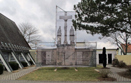 Wer aktuell den Hallstadter Friedhof besucht, wird sich über ein Transparent wundern, welches das Ehrenmal in Originalgröße zeigt. Hintergrund ist die laufende Standortsuche – der Stadtrat hatte in seiner November-Sitzung beschlossen, das Denkmal vom Marktplatz in den Friedhof zu verlegen [8]. Nun werden dort drei verschiedene Standorte ausprobiert.