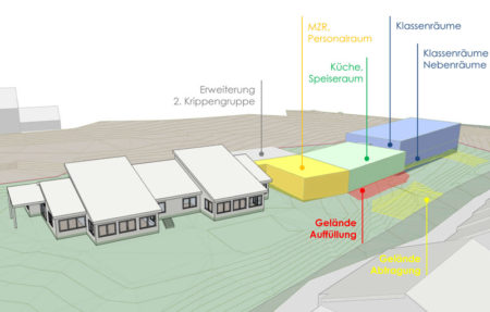 Die hatte Architekt Stefan Paptistella im Gepäck. Er präsentierte verschiedene Varianten, die alle den bestehenden Kindergarten St. Ursula, erweitert um eine Kinderkrippengruppe, mit einbezogen. Denn, so Paptistella: Bereiche wie ein Mehrzweckraum, die Küche, WC-Anlagen oder auch eine Kleinfeld-Turnhalle könnten gemeinsam genutzt werden, was Kosten spare und Synergieeffekte ermögliche. Das neue Schulhaus verortete er nicht mehr am bisherigen Standort, sondern nördlich beziehungsweise östlich des Kindergartens. Vorteil: Während des Neubaus könnten die Schüler im alten Schulhaus verbleiben, ein nahtloser Übergang werde möglich. Die Erschließung des Schulhauses würde dann nicht mehr über die Schulstraße, sondern über den Ellerweg erfolgen. Das alte Grundstück der Schule sowie weitere Flächen im Umfeld könnten zur Wohnbebauung dienen.