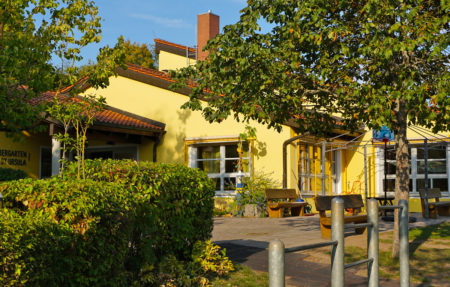 Die Kindertagesstätte St. Ursula in Dörfleins wird vergrößert [6]. Allerdings ist der höhere Bedarf an Betreuungsplätzen schon jetzt vorhanden – eine Behelfslösung musste her. Und die fanden Stadt sowie der Betreiber, die katholische Kirchenstiftung, im alten Schulhaus. Dort wurde, nachdem seit 1. September 2019 bereits eine Krippengruppe hier untergebracht ist, ein ehemaliges Klassenzimmer zu einem Gruppenraum für Kindergartenkinder umgebaut. Und auch eine kleine Turnhalle steht zur Verfügung. Seit 1. September 2020 werden nun auch hier Kinder betreut. Dank eines neu angelegten Wegs zwischen Kindertagesstätte und Schule wurden die Grundstücke zudem miteinander verbunden.