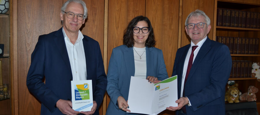 Im Titelbild: Landrat Johann Kalb überreicht die Urkunde zum Umweltpakt Bayern an Sara und Stefan Schardt vom gleichnamigen Hallstadter Ingenieurbüro. (Quelle: Landratsamt Bamberg/Förtsch)