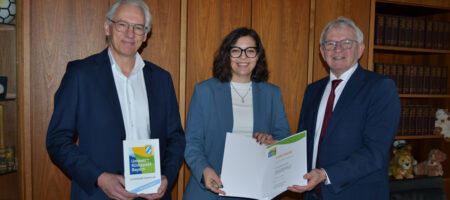 Im Titelbild: Landrat Johann Kalb überreicht die Urkunde zum Umweltpakt Bayern an Sara und Stefan Schardt vom gleichnamigen Hallstadter Ingenieurbüro. (Quelle: Landratsamt Bamberg/Förtsch)