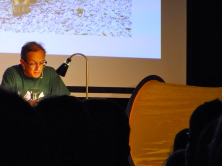 Der Abend begann ruhig – Boning hatte sich einige Kapitel aus seinem Buch ausgesucht, die er vortrug. Hatte er am Anfang noch mit einem eher wortkargen Publikum gerechnet („Ich wurde darauf hingewiesen, dass ich in Franken bin und dass die Leute da nicht einfach Fragen reinrufen“) –lag er damit allerdings falsch. Schnell interagierte das Publikum mit ihm – weil er mit einer Erkältung und etwas heißerer Stimme angetreten war, bekam er mehrfach Hustenbonbons gestellt und musste dann sogar ein Kapitel aus seinem Buch vorlesen, dass es bisher noch nie bei einer Lesung präsentiert hatte. Dabei ging es um Krankheiten, die einem nun einmal widerfahren, wenn man monatelang im Zelt campiert – bei Wind und Wetter.