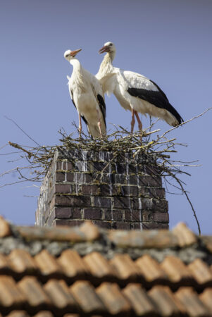 Seit Mitte April erstmal in Kemmern zu Hause: ein Storchenpaar auf dem Kamin der Gastwirtschaft Leicht. Foto: Thomas Ochs.