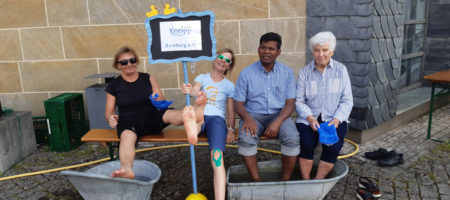 Initiatorin und Organisatorin Carmen Schlichting-Förtsch (Übungsleiterin im Kneipp-Verein Bamberg) – unterstützt von Freunden und Bekannten, unter anderem von der Laufgruppe des SC Kemmern sowie von Mitarbeitern der Gemeinde und Kirchengemeinde Kemmern – lud am ersten Juliwochenende dazu ein, auf dem Kirchenvorplatz einen Barfussweg und die Kneippschen Anwendungen Arm- und Fußbad auszuprobieren.
