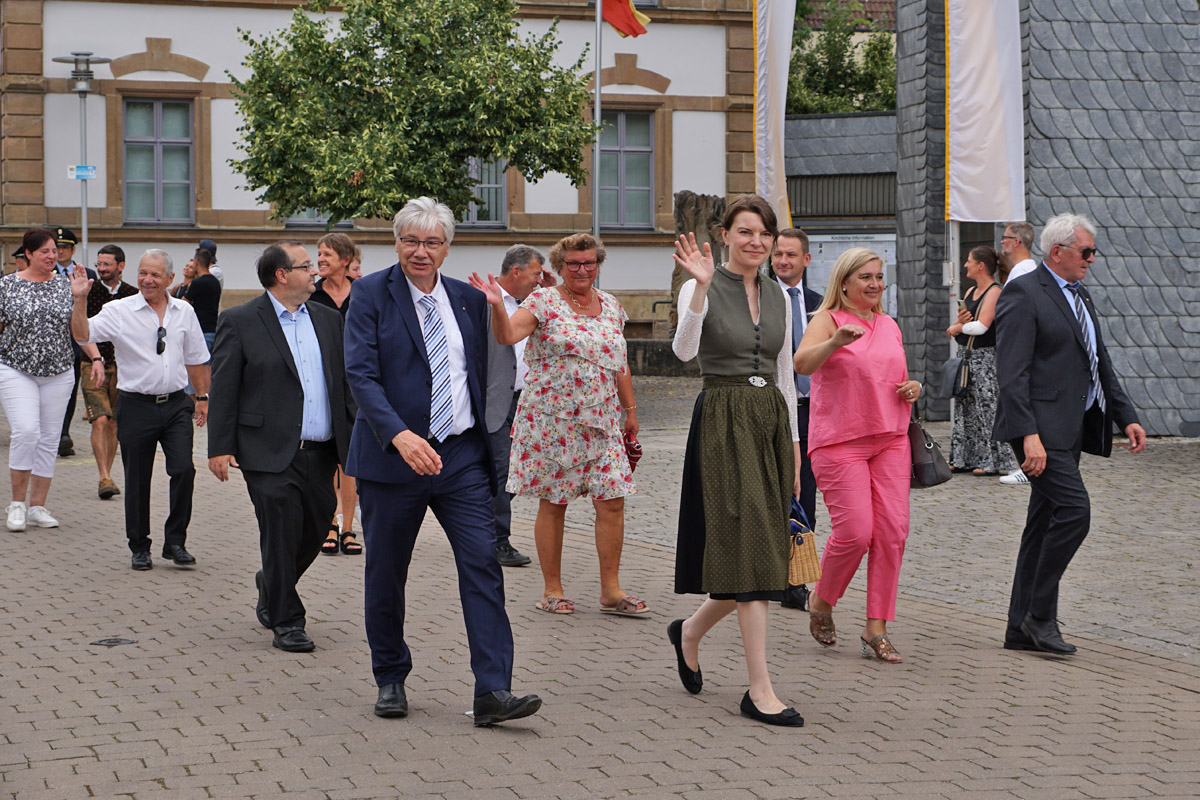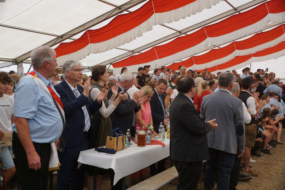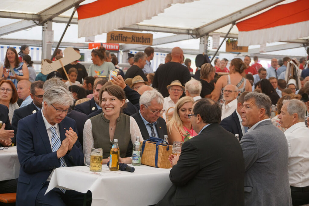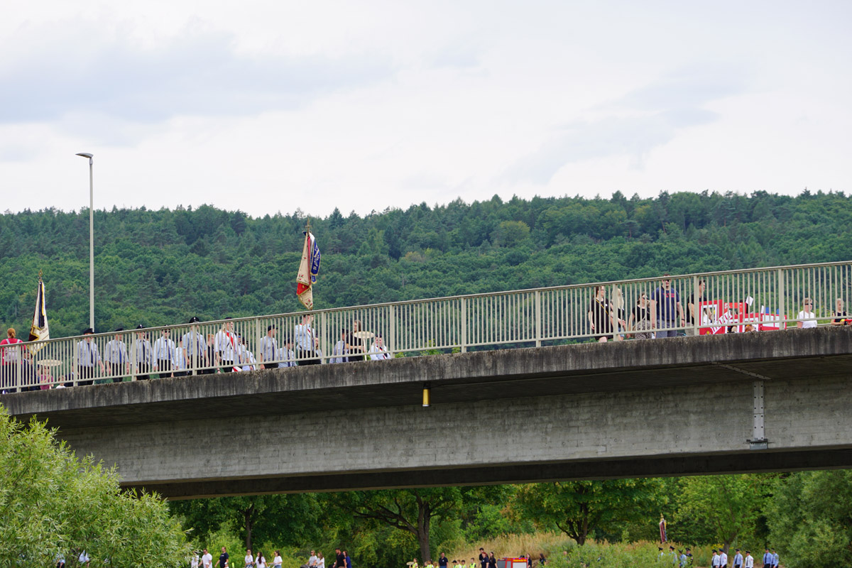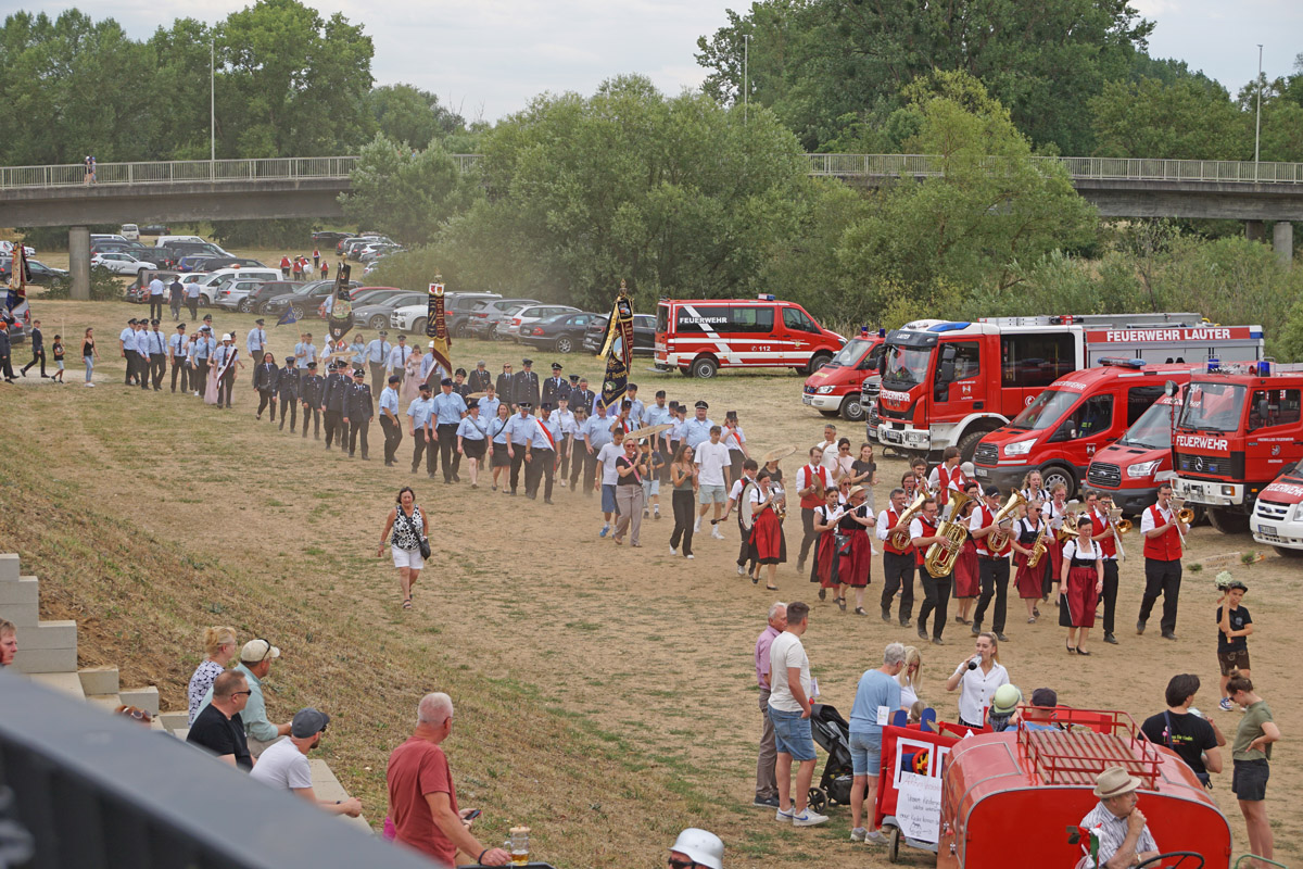 Der Festumzug startete am Sportplatz des SC Kemmern, führte über die Mainbrücke, an der Kirche vorbei in die Breitengüßbacher Straße, zurück in die Hauptstraße und passierte das Rathaus Richtung Festplatz am Main. Dort freute sich Schirmherrin Zeulner über die tolle Atmosphäre und sagte Dank und Anerkennung an die Wehr für das gelungene Fest. Die Feuerwehr sei mit ihrem Einsatz für andere zudem ein Vorbild für die Gesellschaft. Auch Bürgermeister Rüdiger Gerst gratulierte zu einem „herausragenden Jubiläum“ und betonte die immer gute Zusammenarbeit zwischen Gemeinde und Feuerwehr. Landrat Johann Kalb gab die Glückwünsche des Landkreises weiter, und Kreisbrandrat Thomas Renner erinnerte daran, dass die Aufgaben der Feuerwehren immer weiter zunehmen. Mit Sorge blickte er auch auf die aktuellen Waldbrände in den Nachbarbundesländern – auch solche Themen könnten auf die Wehren hier bei uns zukommen.