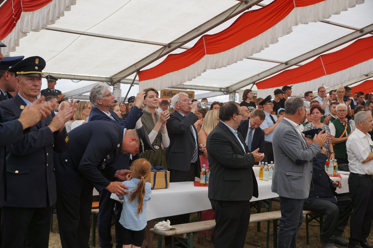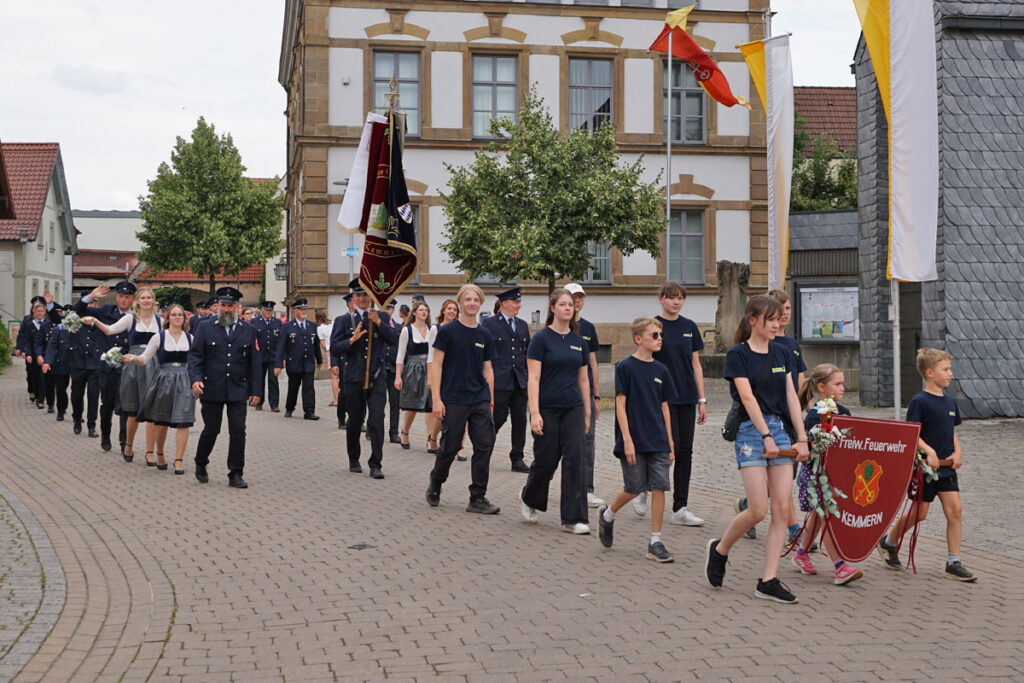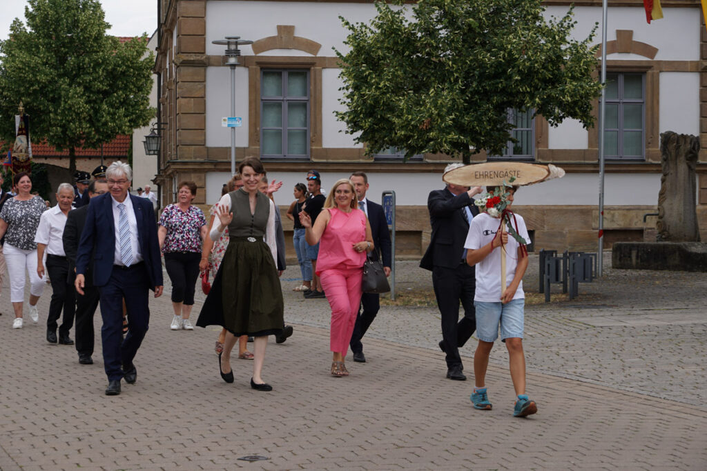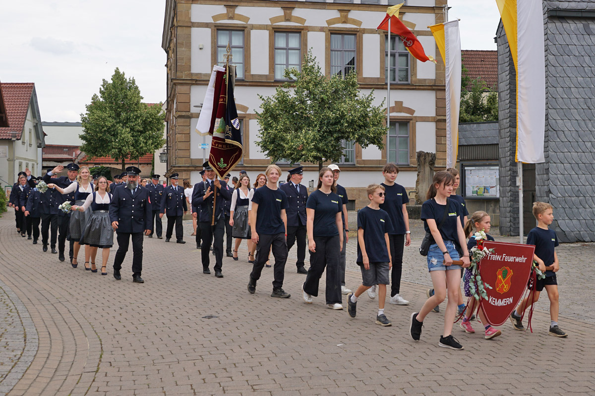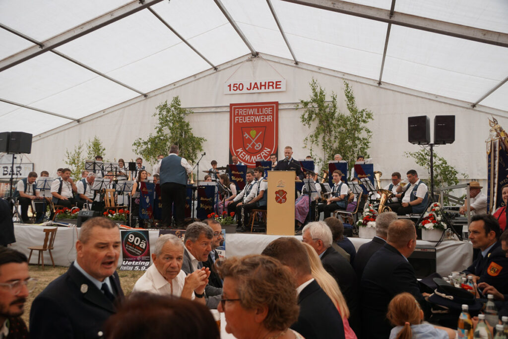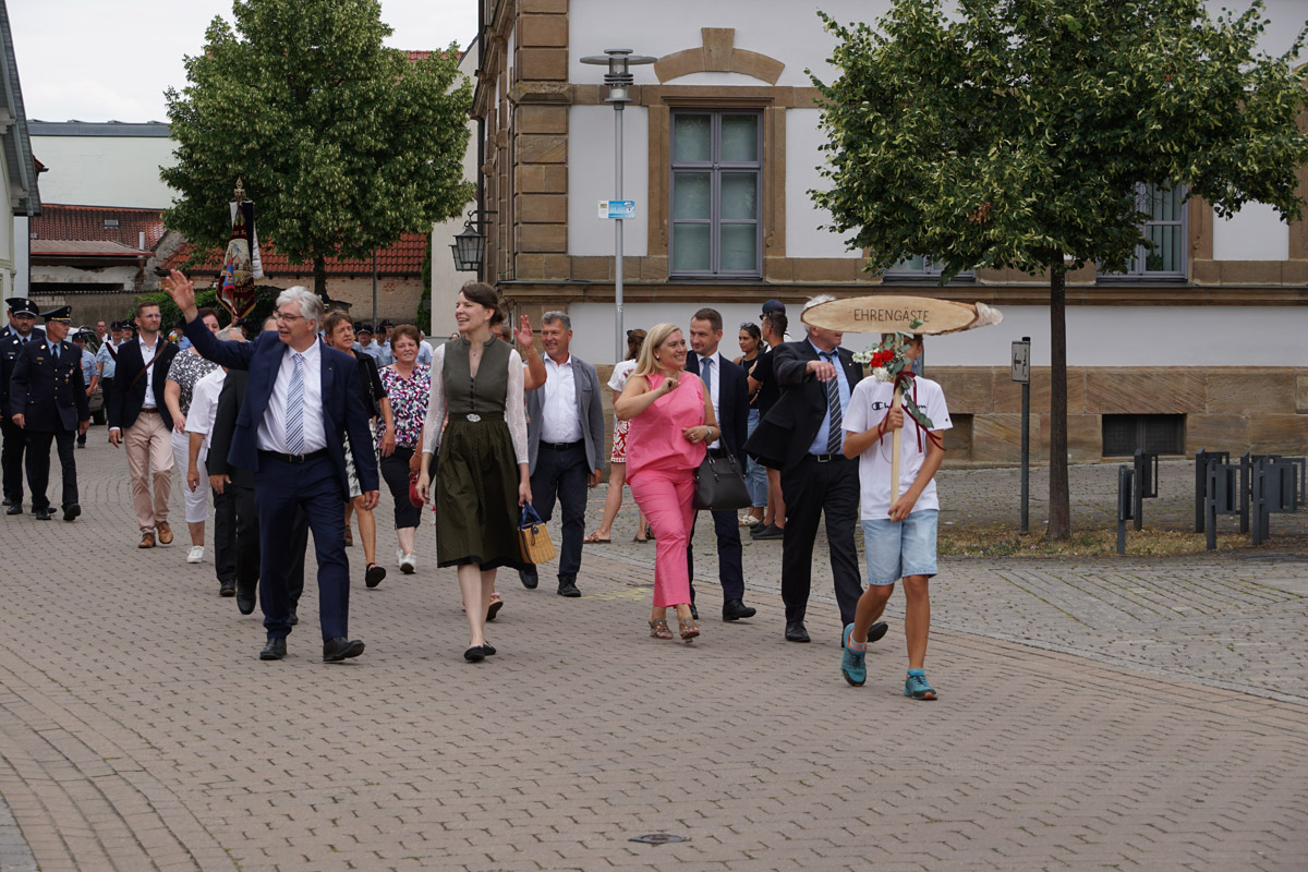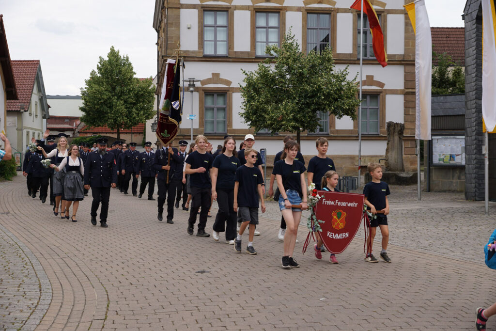 Zuvor war die Feuerwehr Kemmern mit 41 Gruppen, darunter vielen Wehren, Ortsvereinen und den beiden Kindertagesstätten in der Gemeinde, bei einem feierlichen Festumzug durch Kemmern gelaufen. Angeführt vom Musikverein Gundelsheim sorgten zudem die Blaskapelle Ebing, der Musikverein Hallstadt, der Musikverein Dankenfeld und die Jugendblaskapelle Burgwindheim für die musikalische Begleitung. Auch viele Ehrengäste waren gekommen, unter anderem die Schirmherrin und Bundestagsabgeordnete Emmi Zeulner, Bürgermeister Rüdiger Gerst, Landrat Johann Kalb mit seinem Stellvertreter Johannes Maciejonczyk, die Landtagsabgeordnete Melanie Huml und einige Bürgermeisterinnen und Bürgermeister aus der Umgebung. Und natürlich war auch die Führung der Landkreisfeuerwehr mit Kreisbrandrat Thomas Renner an der Spitze anwesend.