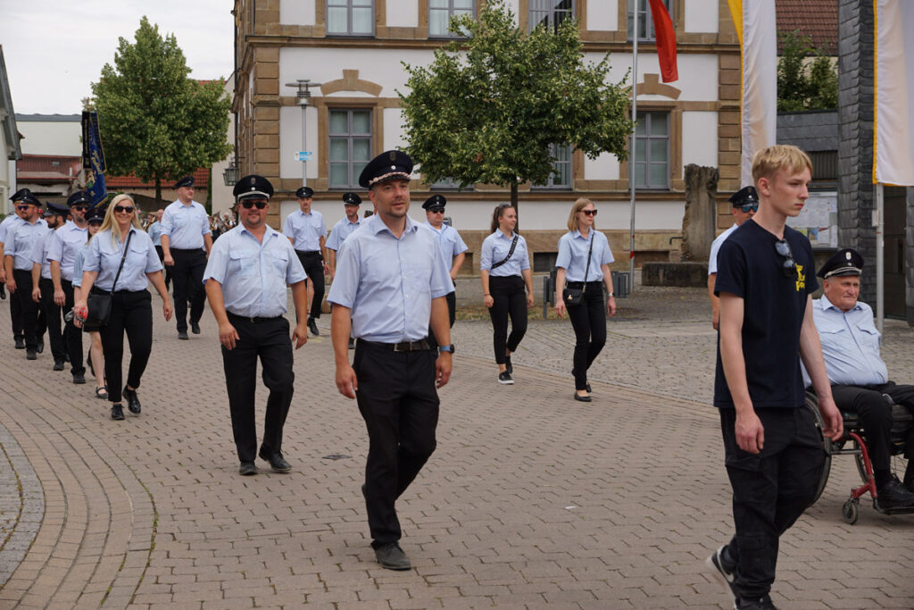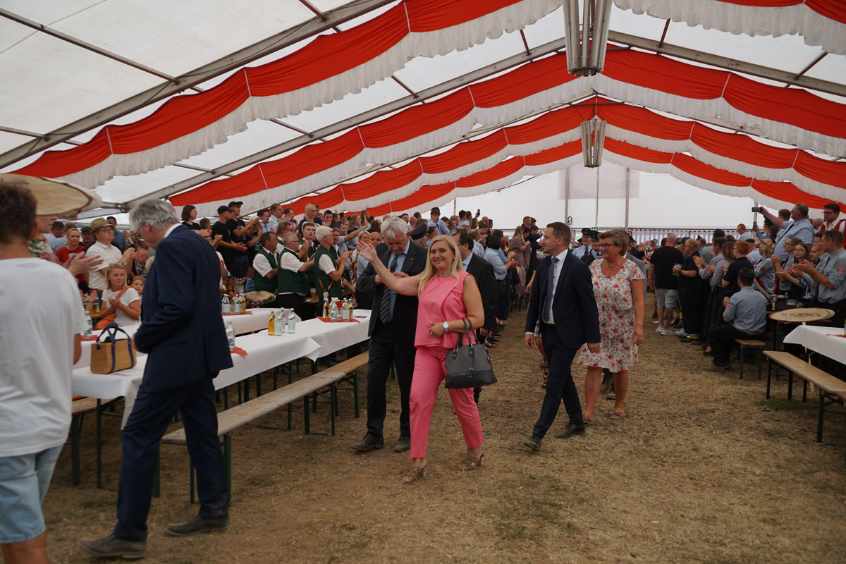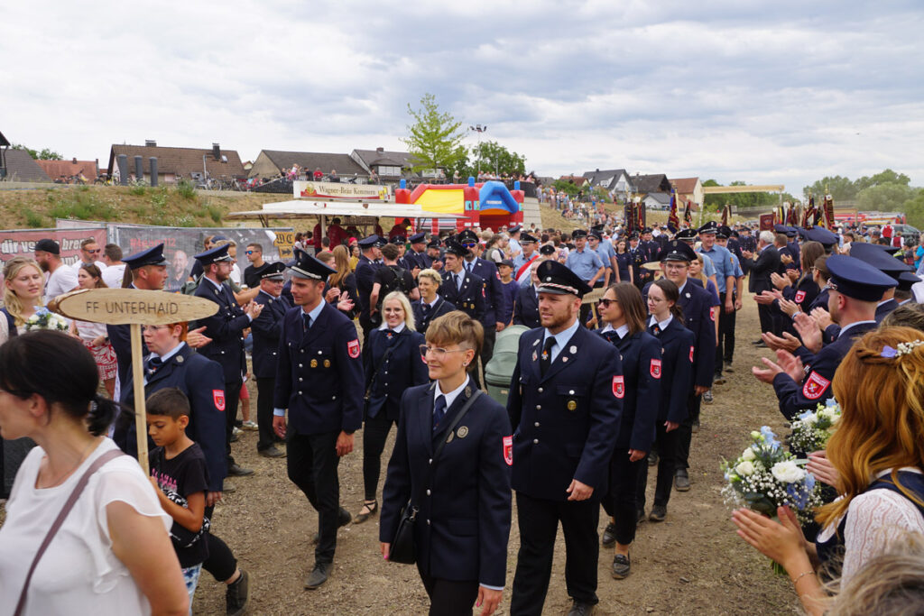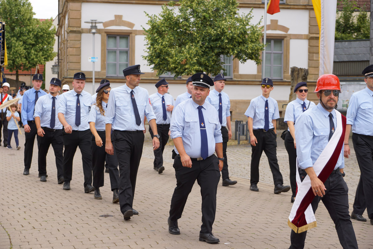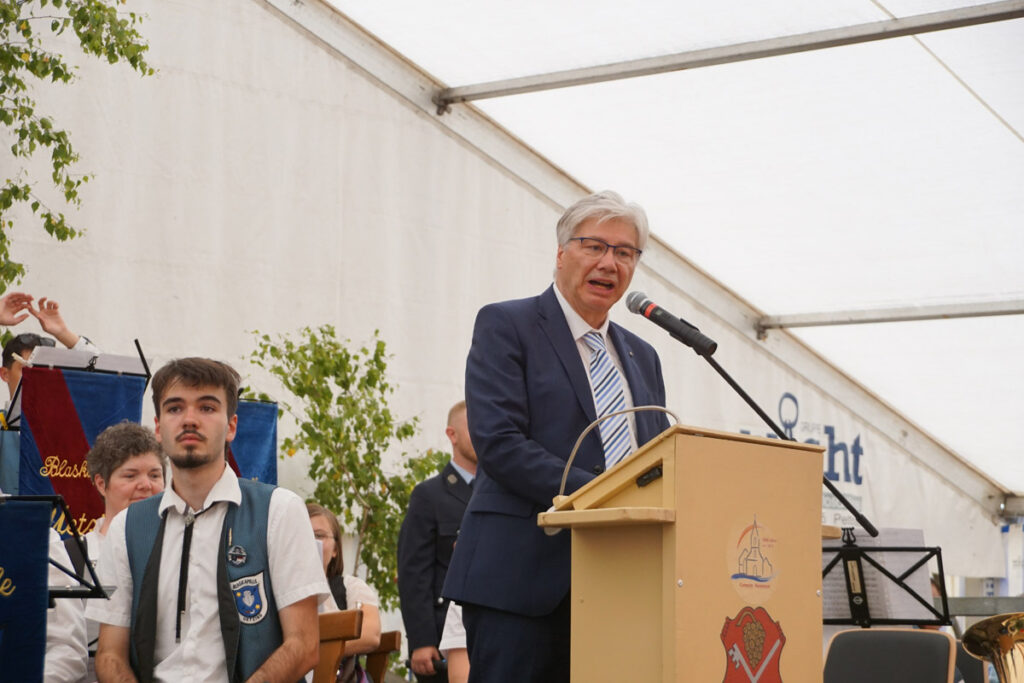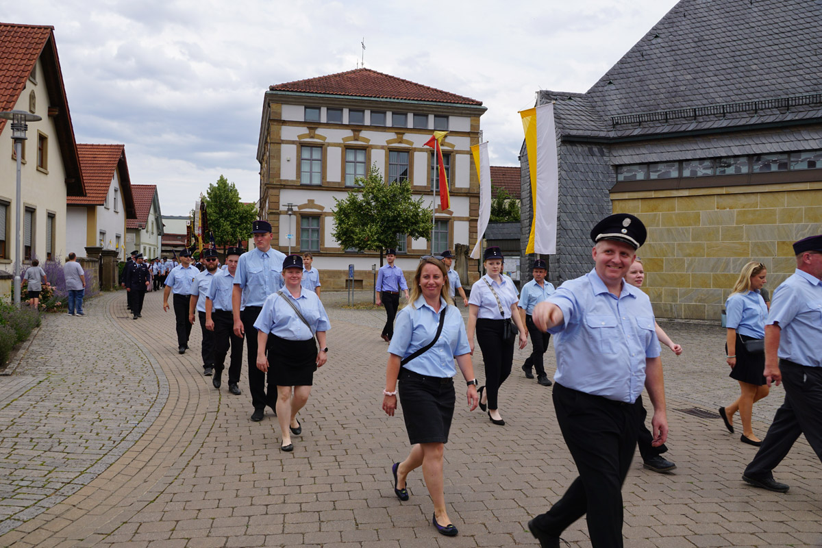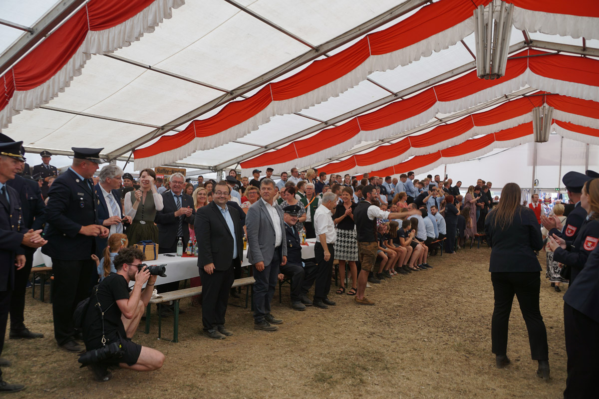 Zuvor war die Feuerwehr Kemmern mit 41 Gruppen, darunter vielen Wehren, Ortsvereinen und den beiden Kindertagesstätten in der Gemeinde, bei einem feierlichen Festumzug durch Kemmern gelaufen. Angeführt vom Musikverein Gundelsheim sorgten zudem die Blaskapelle Ebing, der Musikverein Hallstadt, der Musikverein Dankenfeld und die Jugendblaskapelle Burgwindheim für die musikalische Begleitung. Auch viele Ehrengäste waren gekommen, unter anderem die Schirmherrin und Bundestagsabgeordnete Emmi Zeulner, Bürgermeister Rüdiger Gerst, Landrat Johann Kalb mit seinem Stellvertreter Johannes Maciejonczyk, die Landtagsabgeordnete Melanie Huml und einige Bürgermeisterinnen und Bürgermeister aus der Umgebung. Und natürlich war auch die Führung der Landkreisfeuerwehr mit Kreisbrandrat Thomas Renner an der Spitze anwesend.