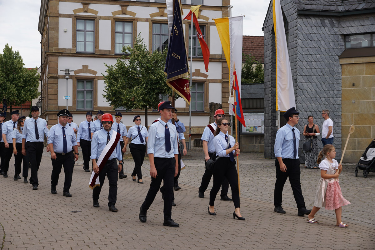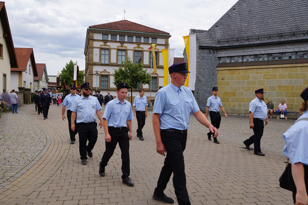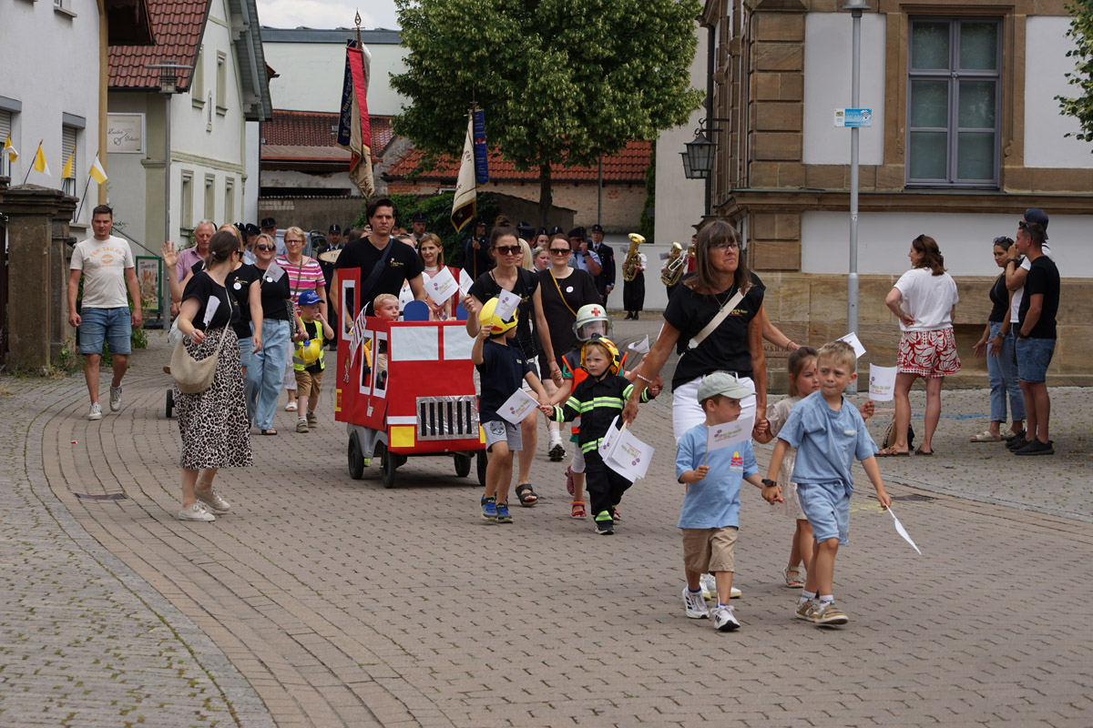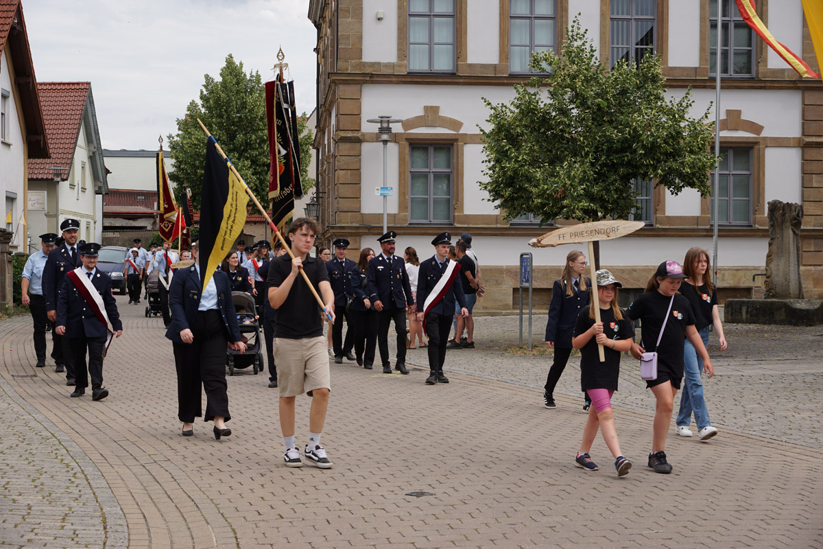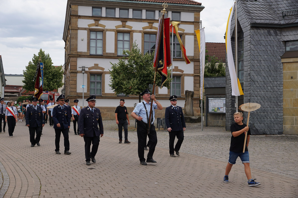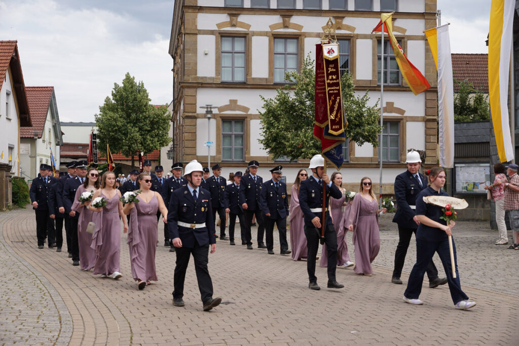 Zuvor war die Feuerwehr Kemmern mit 41 Gruppen, darunter vielen Wehren, Ortsvereinen und den beiden Kindertagesstätten in der Gemeinde, bei einem feierlichen Festumzug durch Kemmern gelaufen. Angeführt vom Musikverein Gundelsheim sorgten zudem die Blaskapelle Ebing, der Musikverein Hallstadt, der Musikverein Dankenfeld und die Jugendblaskapelle Burgwindheim für die musikalische Begleitung. Auch viele Ehrengäste waren gekommen, unter anderem die Schirmherrin und Bundestagsabgeordnete Emmi Zeulner, Bürgermeister Rüdiger Gerst, Landrat Johann Kalb mit seinem Stellvertreter Johannes Maciejonczyk, die Landtagsabgeordnete Melanie Huml und einige Bürgermeisterinnen und Bürgermeister aus der Umgebung. Und natürlich war auch die Führung der Landkreisfeuerwehr mit Kreisbrandrat Thomas Renner an der Spitze anwesend.