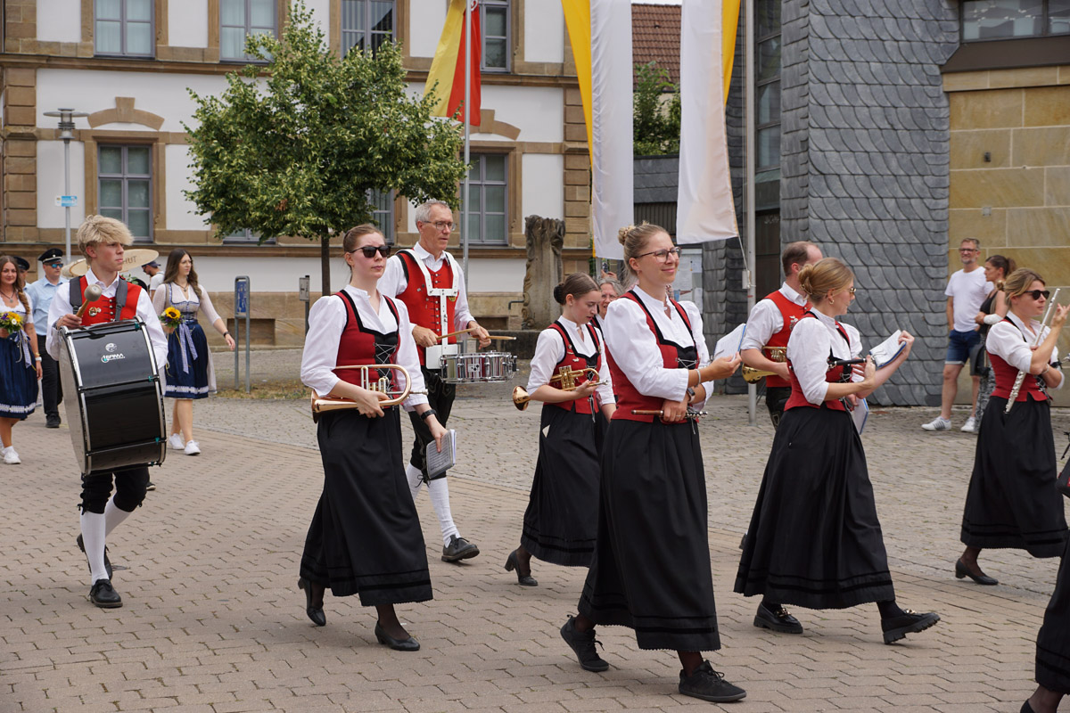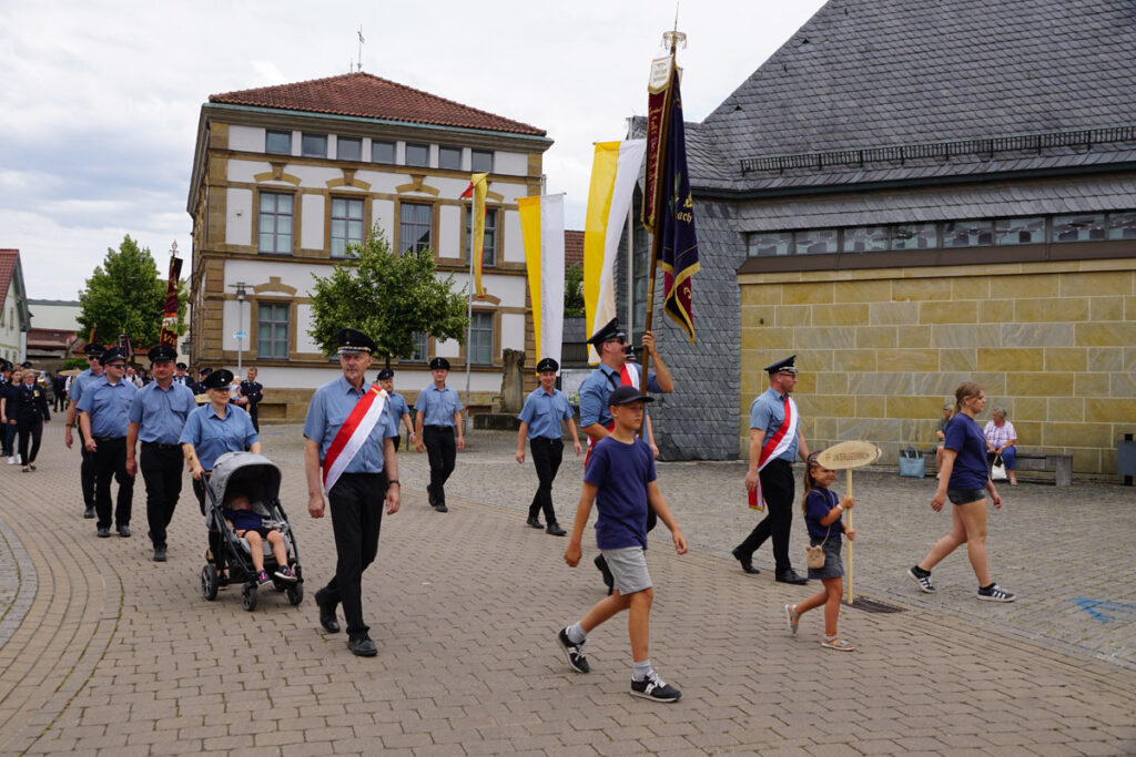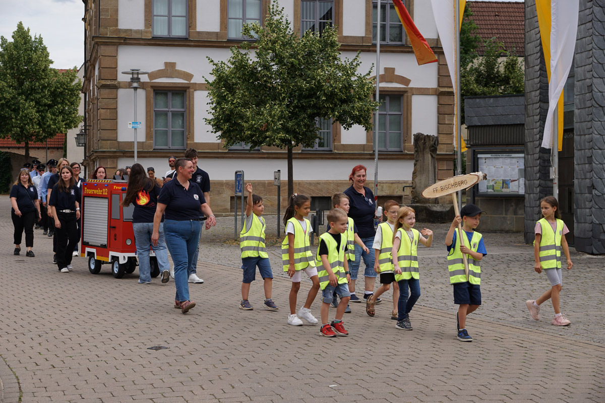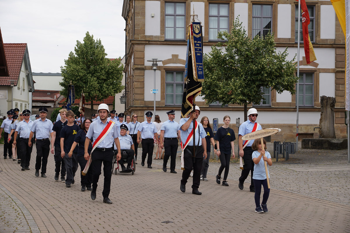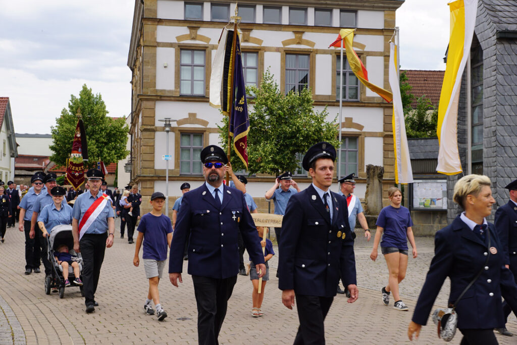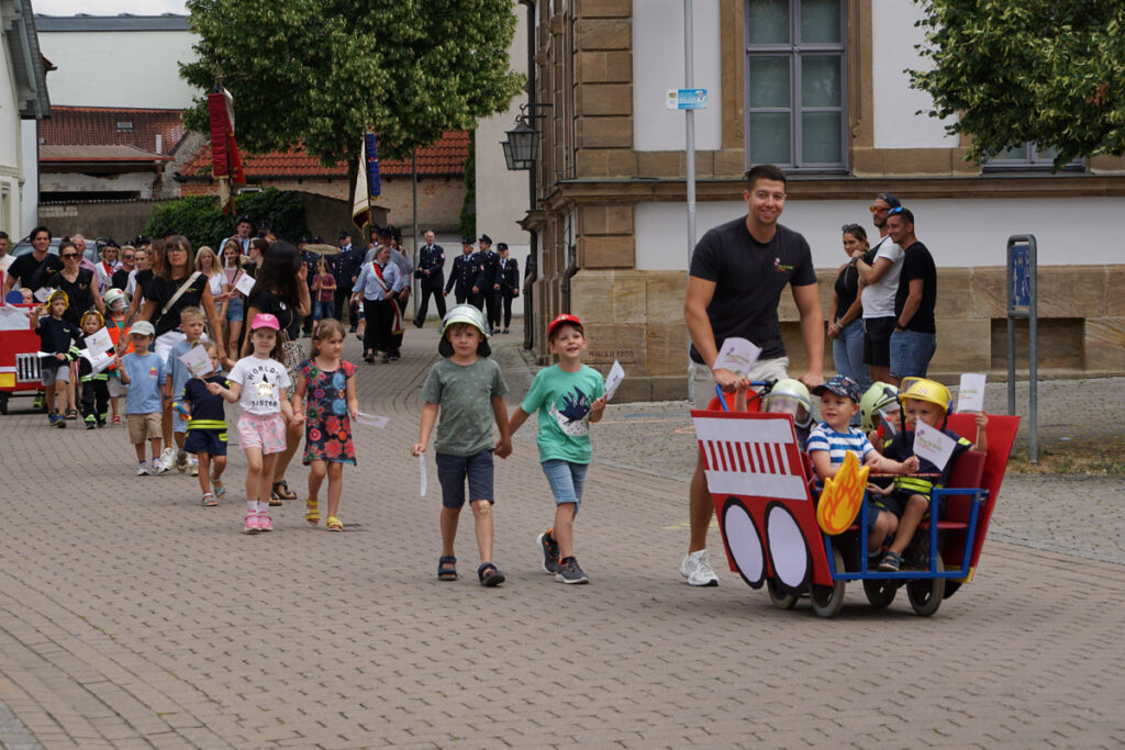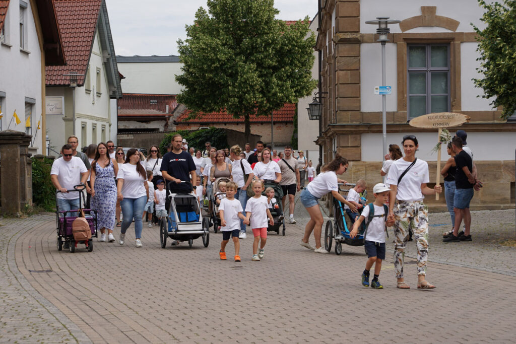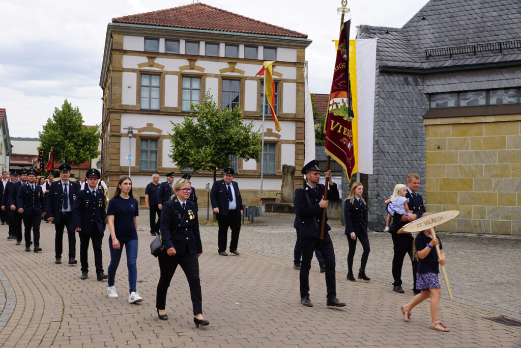 Zuvor war die Feuerwehr Kemmern mit 41 Gruppen, darunter vielen Wehren, Ortsvereinen und den beiden Kindertagesstätten in der Gemeinde, bei einem feierlichen Festumzug durch Kemmern gelaufen. Angeführt vom Musikverein Gundelsheim sorgten zudem die Blaskapelle Ebing, der Musikverein Hallstadt, der Musikverein Dankenfeld und die Jugendblaskapelle Burgwindheim für die musikalische Begleitung. Auch viele Ehrengäste waren gekommen, unter anderem die Schirmherrin und Bundestagsabgeordnete Emmi Zeulner, Bürgermeister Rüdiger Gerst, Landrat Johann Kalb mit seinem Stellvertreter Johannes Maciejonczyk, die Landtagsabgeordnete Melanie Huml und einige Bürgermeisterinnen und Bürgermeister aus der Umgebung. Und natürlich war auch die Führung der Landkreisfeuerwehr mit Kreisbrandrat Thomas Renner an der Spitze anwesend.