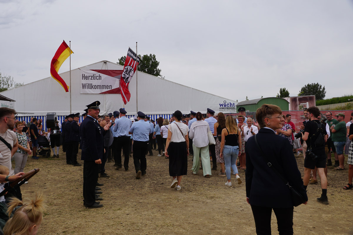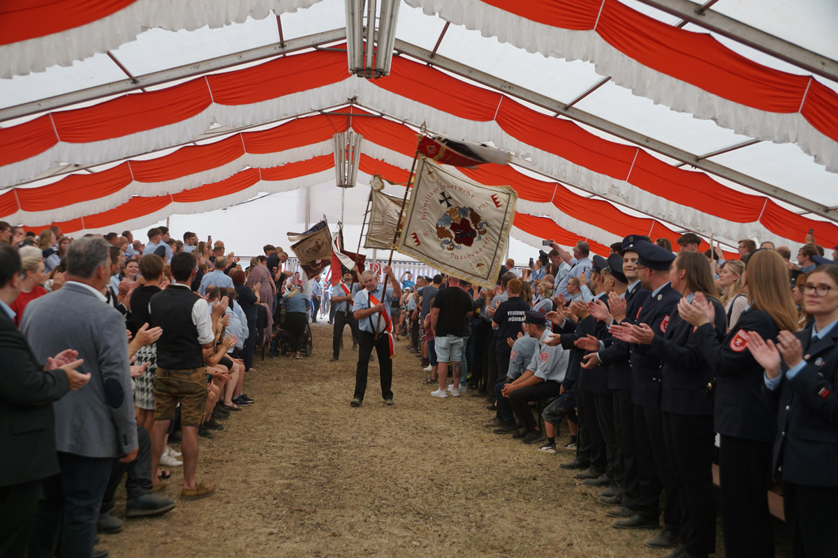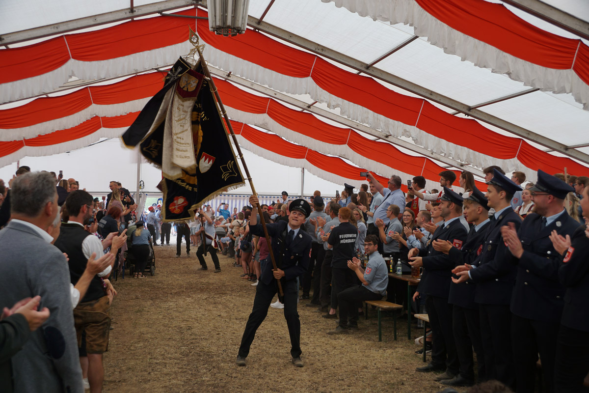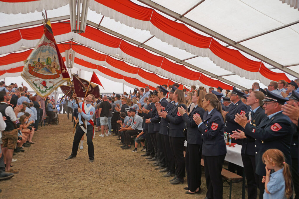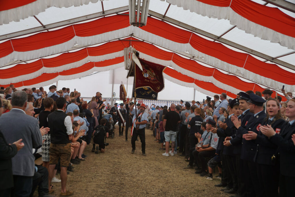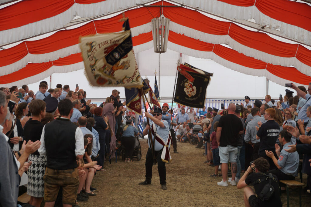 Zwar ist es am Sonntag, 6. Juli 2025, nicht mehr so heiß wie an den Tagen zuvor. Im Festzelt allerdings staut sich natürlich trotzdem die warme Luft. Und als die Fahnenschwenker der zahlreich erschienenen Feuerwehren das Zelt betreten, weht beim einen ein ordentlicher Wind an den Zuschauerinnen und Zuschauern vorbei, beim anderen auch mal ein kleiner Orkan. Und manche im Publikum müssen zeitweilig auch in Deckung gehen, denn die Fahnen sind nun mal ordentlich groß. Ein beeindruckendes Schauspiel …