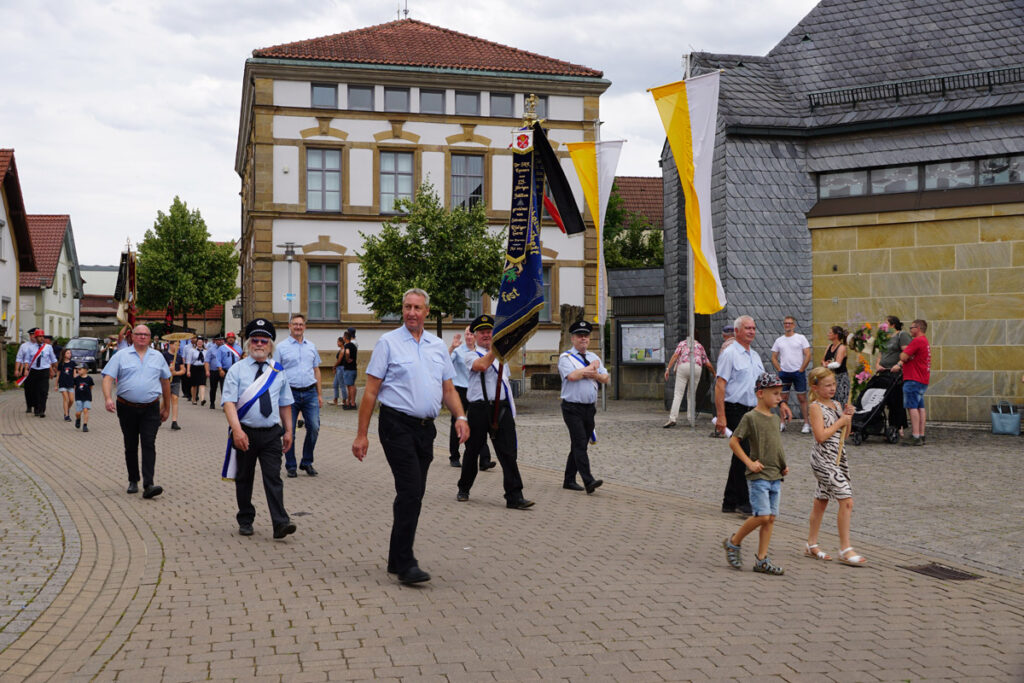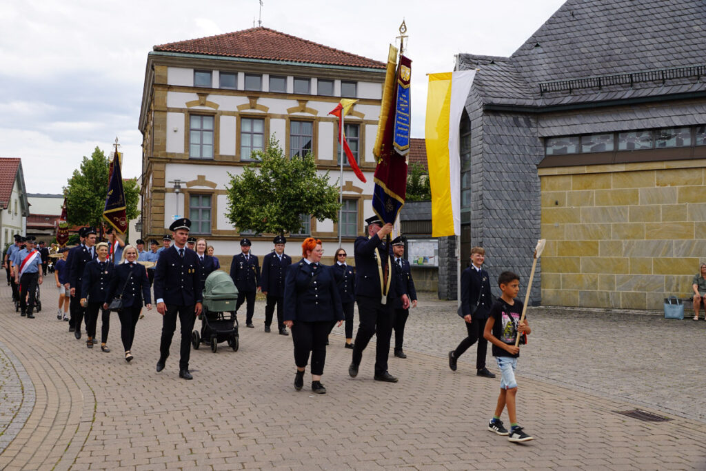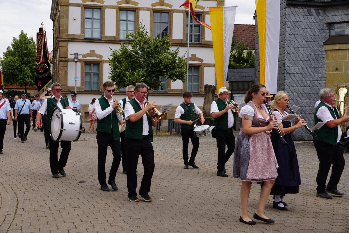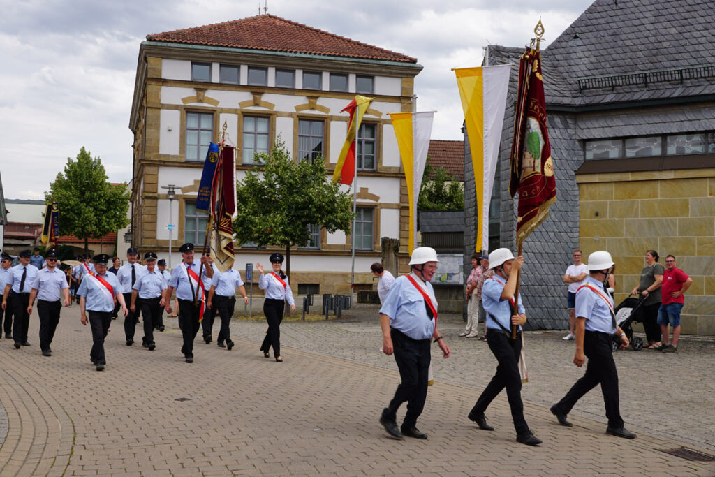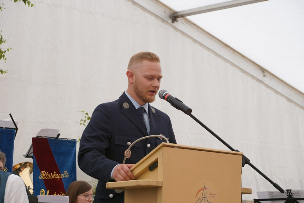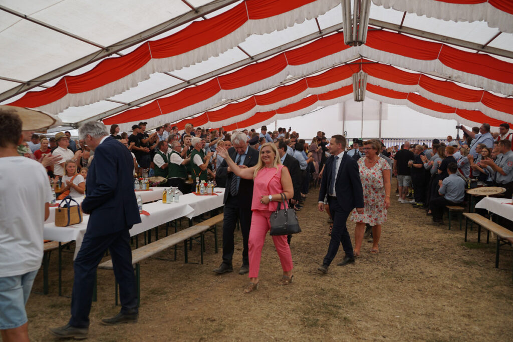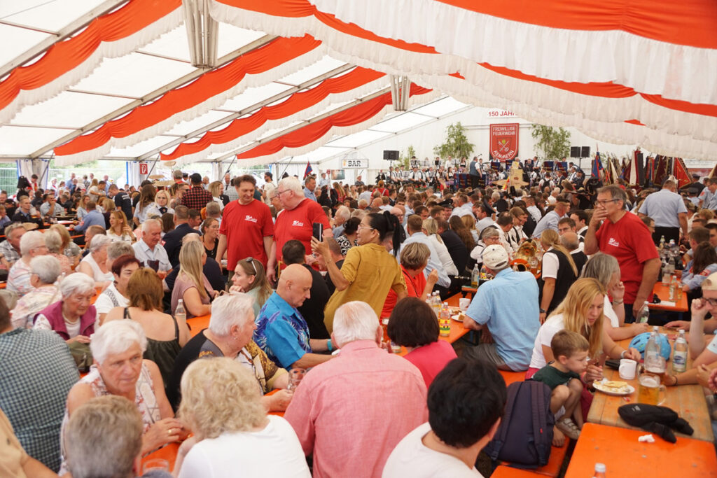 Zwar ist es am Sonntag, 6. Juli 2025, nicht mehr so heiß wie an den Tagen zuvor. Im Festzelt allerdings staut sich natürlich trotzdem die warme Luft. Und als die Fahnenschwenker der zahlreich erschienenen Feuerwehren das Zelt betreten, weht beim einen ein ordentlicher Wind an den Zuschauerinnen und Zuschauern vorbei, beim anderen auch mal ein kleiner Orkan. Und manche im Publikum müssen zeitweilig auch in Deckung gehen, denn die Fahnen sind nun mal ordentlich groß. Ein beeindruckendes Schauspiel …
