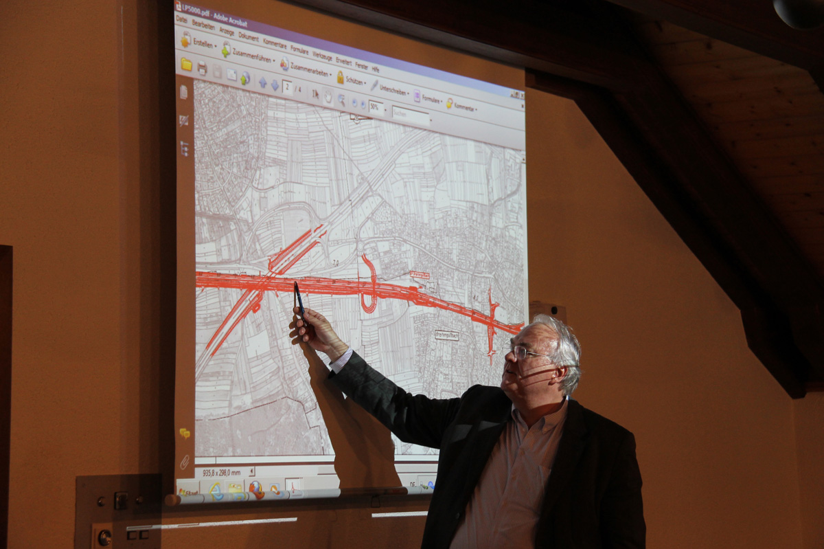 „Gegenüber den Plänen von 1995 hat sich wenig geändert.“ So leitete Martin Eckert die Erläuterung der aktuellen Planunterlagen ein. Das Gleisbett werde für vier Gleise verbreitert, eine 750 Meter lange Strecke zwischen Hallstadt und Breitengüßbach sei als Überholbahnhof geplant, was bedeutet, dass ein zusätzliches fünftes Gleis in der Mitte geführt werde, um eine Ausweichmöglichkeit für langsame Züge zu schaffen. Der Bahnübergang bei Kemmern solle durch eine Brücke für den landwirtschaftlichen Verkehr, die sich am Kreisel von Breitengüßbach anschließt, ersetzt werden. Das bedeute für die Kemmerner Bauern einen zumutbaren Umweg von unter drei Kilometern. Rosi Schmitt fragte direkt, ob dies auch die Autofahrer im Feierabendverkehr auf der B 4 als zumutbar sehen würden, wenn landwirtschaftlicher Verkehr mit 20 Stundenkilometern den Verkehrsfluss verlangsame.