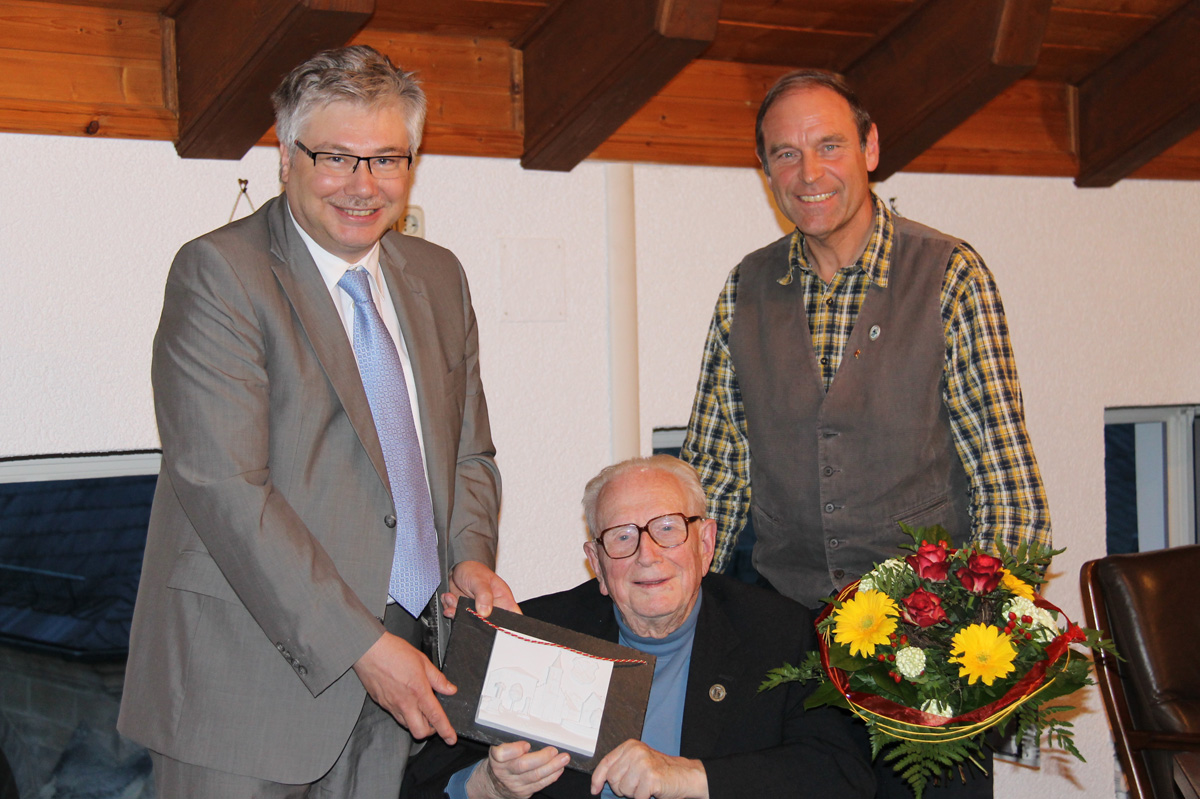 das ihm von Bürgermeister Rüdiger Gerst (links) und 2. Bürgermeister Hans-Dieter Ruß überreicht wurde.