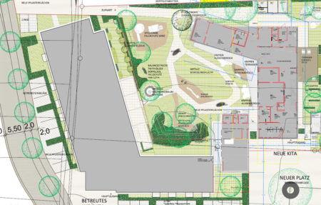 Das gesamte Areal: Links die neu zu bauende Straße mit anschließendem Seniorenzentrum (grau), in der Mitte oben die neue Kita, rechts oben die bestehende Kita St. Maria. Unten das Schulgelände (zum Vergrößern antippen oder anklicken).