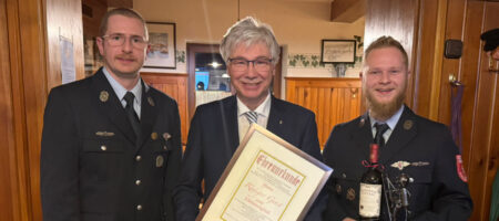 Die große Überraschung für den Bürgermeister Rüdiger Gerst kam dann direkt im Anschluss, als unter dem Punkt „Verschiedenes, Wünsche und Anträge“ der Antrag, ihn zum Ehrenmitglied der Feuerwehr zu ernennen, durch den Kommandanten Sebastian Schneider aufgerufen wurde. Dies wurde auch sofort einstimmig beschlossen und Sebastian und Florian Schneider überreichten Rüdiger Gerst die Urkunde, zur Ernennung zum Ehrenmitglied und ein kleines Präsent. Dieser zeigte sich emotional und freute sich sehr über diese „positive“ und unerwartete, aber sehr angenehme Überraschung. Diese Geste veranlasste den Bürgermeister zu einer weiteren kurzen Ansprache, welche sein persönliches Engagement und seine Leidenschaft zur Thematik Notfallversorgung gerade im Hinblick auf die langjährige Mitgliedschaft im Zweckverband für Rettungsdienst und Feuerwehralarmierung deutlich machte. Die medizinische Versorgung im nördlichen Landkreis Bamberg solle noch weiter verbessert werden, wofür sich Rüdiger Gerst gerne auch in Zukunft im Kreistag einsetzen möchte.