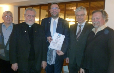 Der Vorstand erklärte den Sinn und die Wichtigkeit dieser Funktion. Monsignore Witzgal überreichte die Ernennungsurkunde und eine Anstecknadel, die als äußeres Zeichen dient. Mit großer Freude und Dankbarkeit nahm Markus Schürrer diese Ernennung an. Im Rahmen dieser Versammlung wurden dann die langjährigen Mitglieder geehrt. So konnten Pankraz Kraus und Peter Keller auf 50 Jahre, Siegfried Brehm und Ekkehard Engelmann auf 40 Jahre, sowie Günter Vogel und Eduard Loch auf 25 Jahre zurückblicken.