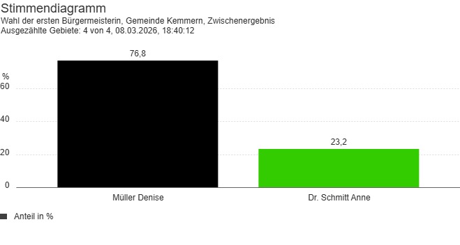 Kemmern bekommt eine neue Bürgermeisterin: Denise Müller. Die CSU-Kandidatin gewann die Bürgermeisterwahl gegen ihre Mitbewerberin Dr. Anne Schmitt (Bündnis 90/Die Grünen).