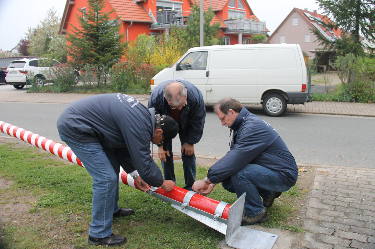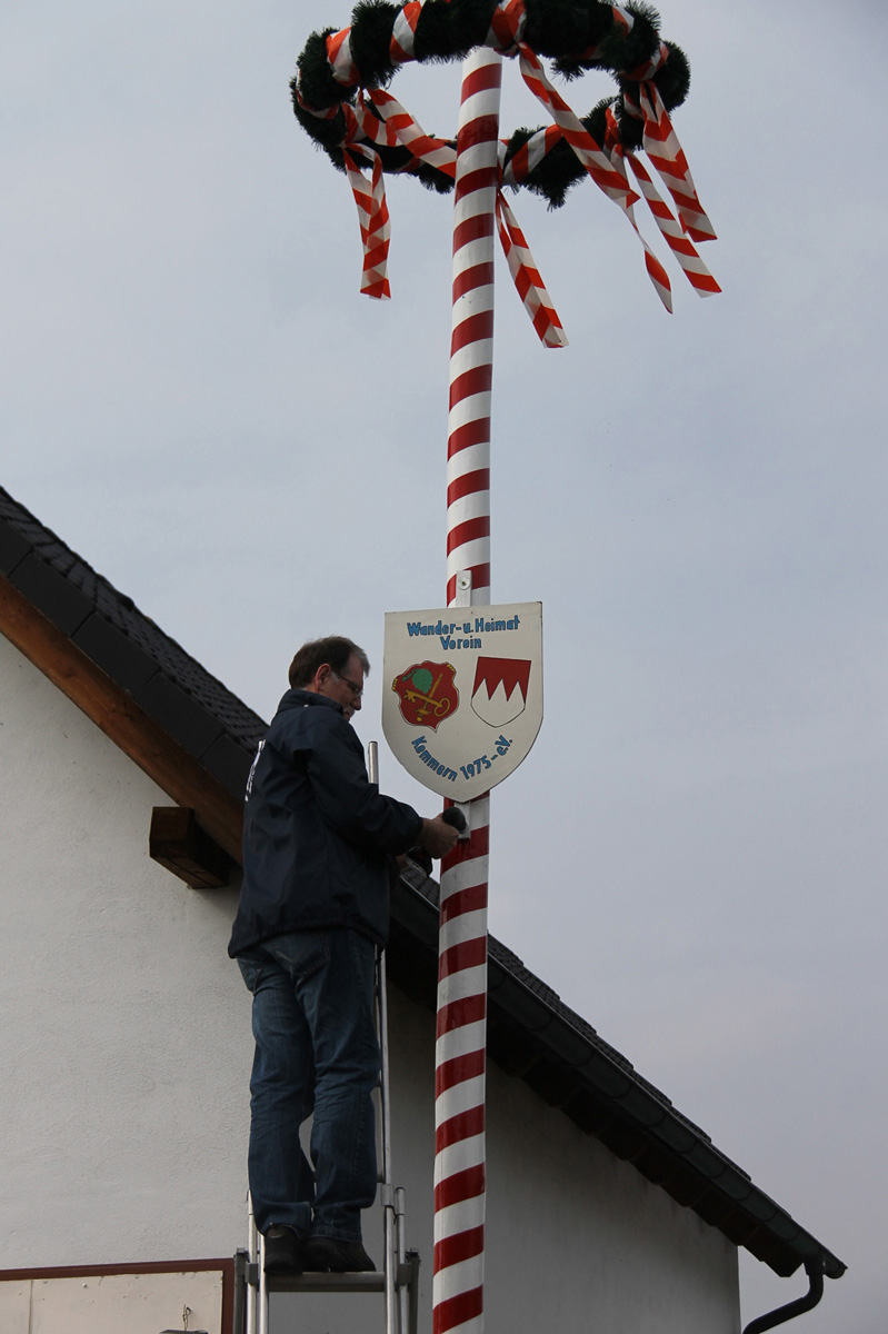 Die Vorsitzende des Wander- und Heimatvereins, Betty Höpfner, hofft noch auf etwas besseres Wetter, ist aber zuversichtlich, dass – wenn auch heuer vielleicht etwas später – genügend Kemmerner und Mai-Ausflügler aus dem Umland am Maibaum vorbeischauen und rasten werden. Der Kemmerner Verein mit 100 Mitgliedern widmet sich unterm Jahr der Pflege und der Betreuung der umliegenden Wanderwege und deren Beschilderung. Die Tradition des Maibaumstellens hat der Wander- und Heimatverein 2003 übernommen. Hans Höpfner und Enkel Alex Grünwald haben für 2013 eine extra Vorrichtung konstruiert, welche den Männern die Prozedur erleichtern und den Baum fest in der Erde verankern soll. Dementsprechend unspektakulär und schnell geht das Aufstellen dann auch von statten, wenn auch nicht ohne Muskelkraft und Zupacken