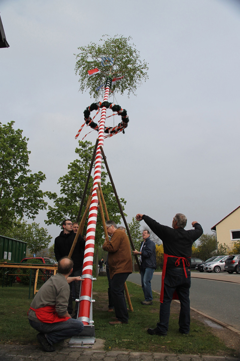 „Wenn in Kemmern ein Fest gefeiert wird, dann passt das Wetter.“ Trotz regnerischer Tendenzen trifft dies auch beim Maibaumaufstellen wieder zu. Schon vor 9 Uhr werkeln fleißige Mitglieder des Wander- und Heimatvereins Kemmern rund um ihr Vereinsheim und treffen die letzten Vorbereitungen, damit sie den Maibaum eine Stunde später aufstellen können. Bereits zum elften Mal richtet der Wanderverein das traditionelle Maibaumaufstellen aus und ist, günstig an der „Fahrradautobahn“ gelegen, über den Tag verteilt ein beliebter Halt für Mai-Ausflügler. Heuer wird der insgesamt neun Meter lange Maibaum erstmals mit einer extra Konstruktion in die Senkrechte gebracht.
