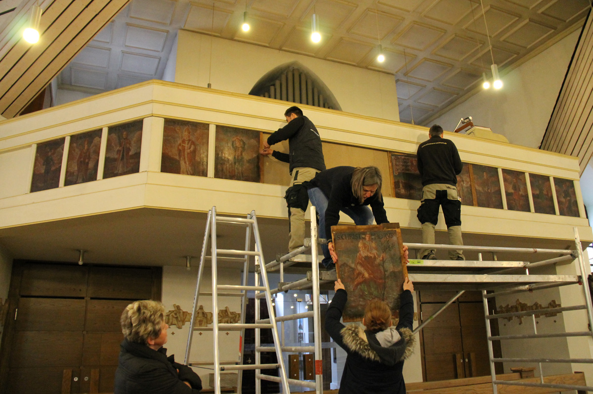 Seit der Benefizlesung Paul Weismantels war es still um die neue Orgel geworden, aus der noch 2013 in St. Peter und Paul die ersten Töne erklingen sollen. Am vergangenen Dienstag, 30. April, wurden die ersten notwendigen Maßnahmen für den Umbau der Empore und den darauf folgenden Einbau der neuen Orgel sichtbar: Die 16 Heiligen sowie das Mittelbild wurden von Diplom-Restauratorin Jutta Minor fachgerecht aus der Brüstung der Empore gelöst und zur bestandswahrenden Konservierung abtransportiert. Die unter Denkmalschutz stehenden Barockgemälde werden nach der Restauration wieder ihren Platz in der Brüstung der dann neu gestalteten Empore einnehmen.
