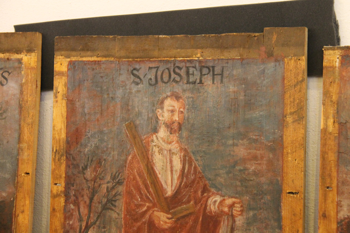 Hier tut sich was: Mit Schraubenzieher steht Jutta Minor auf dem fahrbaren Gerüst im Kirchenraum St. Peter und Paul in Kemmern und entfernt vorsichtig und mit Hilfe von Schreiner Gerhard Eichhorn die Holztafeln aus der Orgelempore. Während der Orgelbauer Roman Seifert in Kevelaer noch an der neuen Orgel baut, werden unter Aufsicht von Pfarrer Valentin Tempel und Kirchenpflegerin Rosi Schmitt die ersten Vorkehrungen für den Umbau der Empore getroffen. Der erste sichtbare Schritt ist die Restauration der insgesamt 17 Barockgemälde, die seit dem Umbau des Gotteshauses 1978 die Brüstung der Empore zieren. Die in Auftrag gegebene Konservierung der Bildertafeln ist eher eine kleine Maßnahme und beinhaltet das Reinigen und wenn nötig kleinere Retuschen der in Öltempora gemalten Bilder. „Die wurden schon einmal gekürzt“, stellt Diplom-Restauratorin Jutta Minor fest, als sie die 17 Holztafeln gelöst hat. Wie sich herausstellt, sind die Tafeln nicht fachgerecht zugeschnitten, so dass die Bilder nicht mittig auf der Tafel platziert, die Kanten nicht gerade sind oder gar ganze Ecken fehlen.