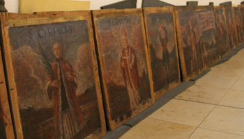 Seit der Benefizlesung Paul Weismantels [6] war es still um die neue Orgel geworden, aus der noch 2013 in St. Peter und Paul die ersten Töne erklingen sollen. Am vergangenen Dienstag, 30. April, wurden die ersten notwendigen Maßnahmen für den Umbau der Empore und den darauf folgenden Einbau der neuen Orgel sichtbar: Die 16 Heiligen sowie das Mittelbild wurden von Diplom-Restauratorin Jutta Minor fachgerecht aus der Brüstung der Empore gelöst und zur bestandswahrenden Konservierung abtransportiert. Die unter Denkmalschutz stehenden Barockgemälde werden nach der Restauration wieder ihren Platz in der Brüstung der dann neu gestalteten Empore einnehmen.
