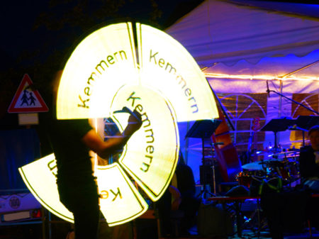 [8]Für viel Stimmung sorgte anschließend Feuerkünstler und Jongleur MAD-HIAS (Mathias Schmitt) aus Beilngries, der nicht nur auf einem Hochrad die Fackeln schwang, sondern nach Einsetzen der Dunkelheit auch eine extra für Kemmern zusammengestellte Lichtshow zeigte. Mit zwei Leuchtstäben projizierte er Bilder zur Geschichte Kemmerns in die Luft. Und um halb elf durften dann Bürgermeister Rüdiger Gerst und zweiter Bürgermeister Hans-Dieter Ruß den Schriftzug „1000 Jahre“ entzünden.