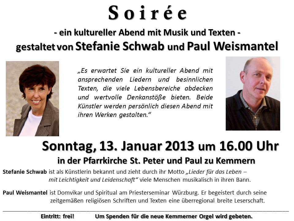 Die Zusammenarbeit mit der Würzburger Liedermacherin Stefanie Schwab wird eine Premiere sein, wie auch die Illumination der Pfarrkirche durch Pfarrer Valentin Tempel, der St. Peter und Paul in blaues Licht tauchen wird, um den meditativen Charakter zu unterstützen. Die Thematischen Schwerpunkte des Abends, „Zeit, Begegnung, Segen und segnen“ sind für den Jahresanfang bewusst gewählt.