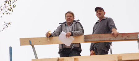 Die Tradition des Richtfests lässt sich bis ins 14. Jahrhundert zurückverfolgen. Auch heute noch wird es gefeiert – und traditionell hält der Zimmermann eine Ansprache, stößt auf das Projekt an und wirft anschließend sein Glas vom Dach Richtung Boden. Zerspringt es, wird das als gutes Omen für den Bau gesehen. Und so verlief auch das Richtfest für das Service-Wohnen in Kemmern. Zimmerer Ralf Lindenlaub von Holzbau und Zimmerei Finzel-Lindenlaub aus Itzgrund war für den offiziellen Akt zuständig.
