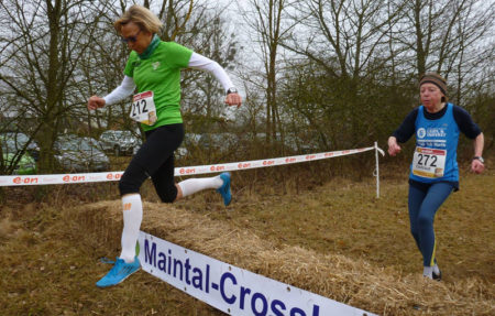Für eine Sensation hat Sibylle Vogler bei den Deutschen Crosslauf-Meisterschaften gesorgt. Die Langstreckenläuferin gewann den Titel der Altersklasse W70. Die Seniorinnen W50 und älter hatten vier Runden, Startrunde 1,8 km plus dreimal 1,1 km, zusammen ca. 5,2 km zu absolvieren. Die Strecke, gespickt mit Strohballen, kleinen Wällen, schrägen Abschnitten und einem Bach über den man springen musste, verlangte den Teilnehmern so einiges ab.