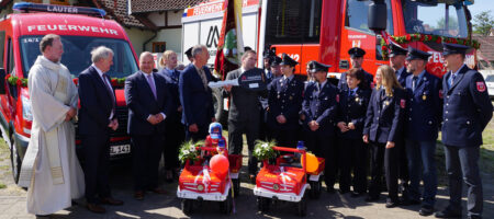 Die Nachwuchskräfte der Feuerwehr aus Lauter dürfen sich ganz besonders freuen. Zwei Feuerwehr-Tretautos wurden gesegnet und offiziell in Dienst gestellt. Ach ja, und zwei „richtige“ Feuerwehr-Fahrzeuge natürlich auch. Und 150-Jähriges feierte die Feuerwehr zudem.