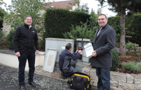 Neben dem Bürgermeister Ronny Beck (re.) ist auch der zuständige Kommunalmanager der Bayernwerk Netz GmbH, Christian Ziegler (li.), bei der Installation von insgesamt fünf intelligenten Messsystemen in der Gemeinde Lauter vor Ort.