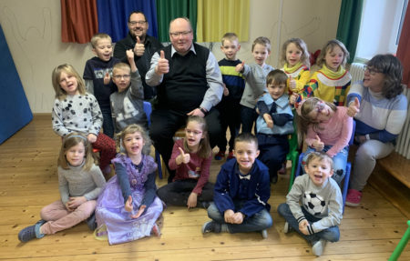 Die Kinder bereiteten bereits mit der Leitung des Kindergartens, Anette Müller, im Voraus im Rahmen des Projektes „Kirche kennenlernen“ ein Interview mit Dekan Stefan Gessner vor. Die Gesprächsrunde wurde im Morgenkreis mit der Begrüßung und einem Gebet eröffnet. Aufregung lag in der Luft.