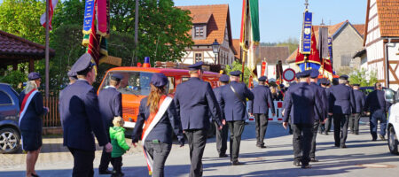 Ein wunderschöner Frühlingstag in Mürsbach. Überall Blumen, Sonne am Himmel – und wie sollte es bei einem Feuerwehrjubiläum anders sein: viele rote Fahrzeuge. Und natürlich Feuerwehrfrauen und -Männer. Über 150 waren gekommen, zumeist von Wehren aus der Nachbarschaft. Denn das 150. Jubiläum der Mürsbacher Wehr wurde klein gefeiert. Mit einem Festzug von der Dreifaltigkeitskapelle bis zum Festzelt im Ortskern, direkt vor dem Feuerwehrhaus, wo auch ein Festgottesdienst stattfand.