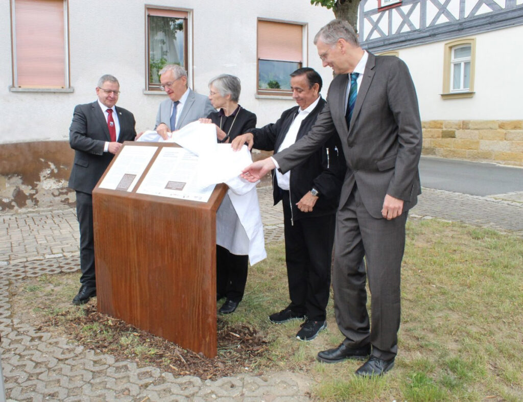 Zum Abschluss des ersten Teils dieser Gedenkveranstaltung wurde die Informationstafel von der Rednerin, den vier weiteren Rednern und Moderator Becher behutsam enthüllt. Im Text hervorgehoben wurde die enge lokale Verbundenheit mit den Sinti-Familien Braun, Ernst, Franz und Friedrich. Sie waren katholisch und Teil der Dorfgemeinschaft, sie waren Berufsmusiker, Artisten sowie als Schausteller und Händler tätig.