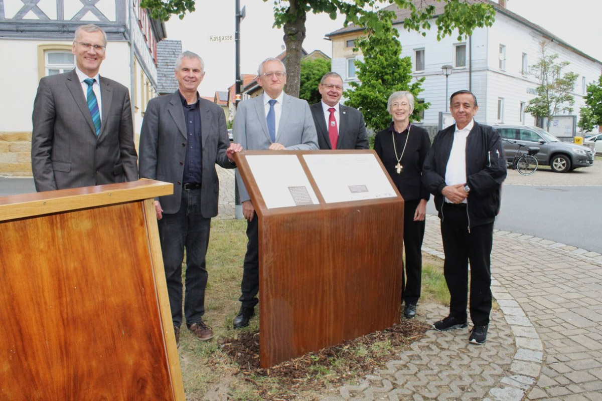 Nach der Enthüllung der Tafel in Rattelsdorf: Andreas Beneker, Leiter des EBZ Bad Alexandersbad; Martin Becher, ELKB; Bezirksheimatpfleger Prof. Dr. Günter Dippold; Erster Bürgermeister Hans-Jürgen Scheerbaum (Rattelsdorf); Regionalbischöfin Berthild Sachs (ELKB Bayreuth); Verbandsvorsitzender Erich Schneeberger der VDSR Bayern