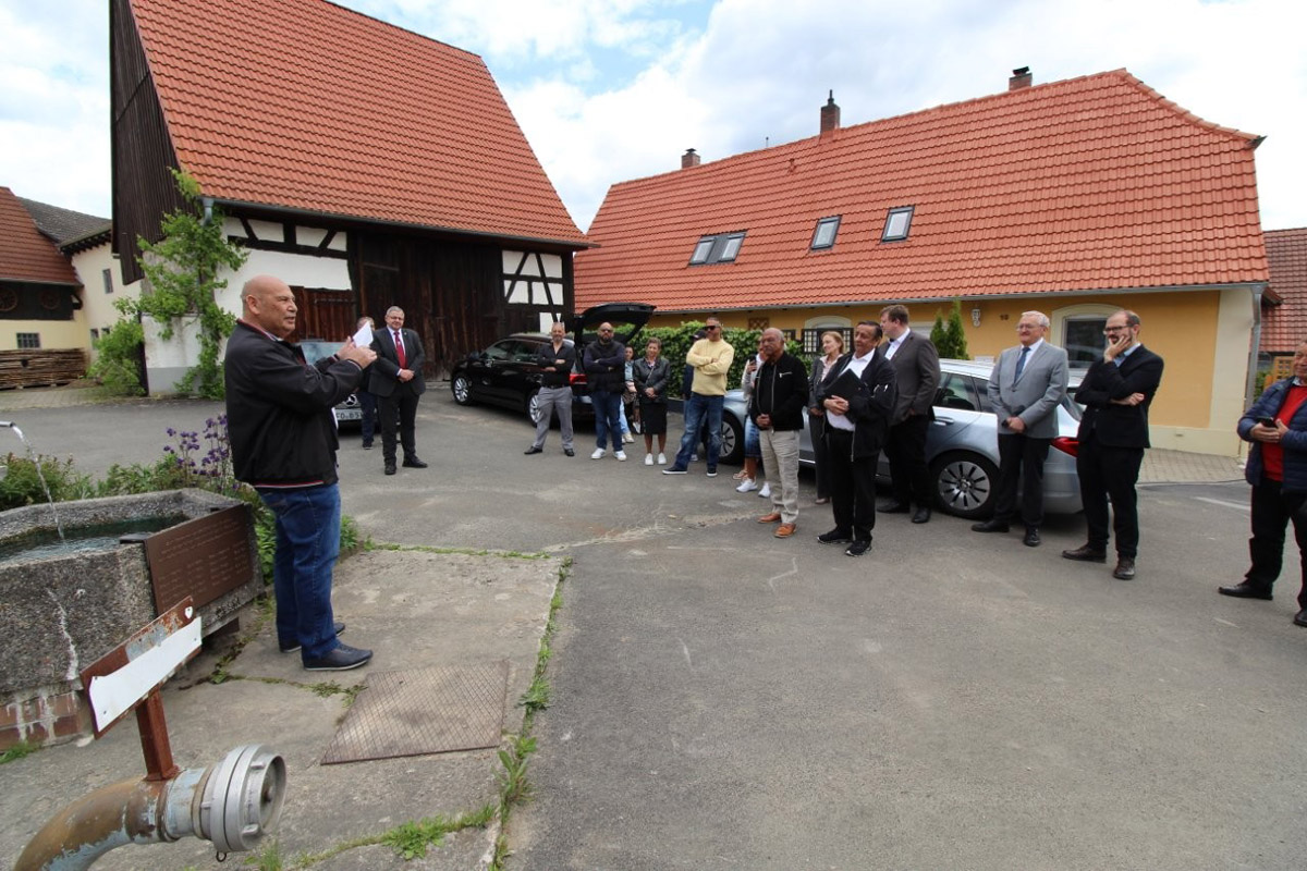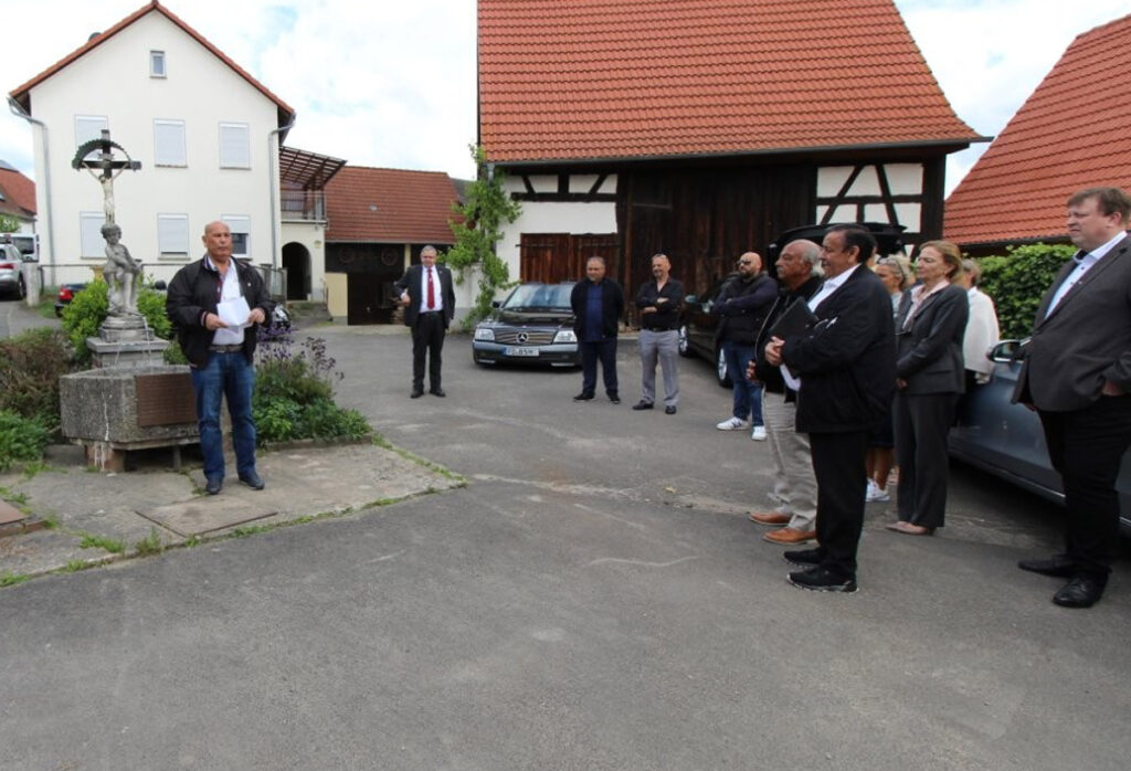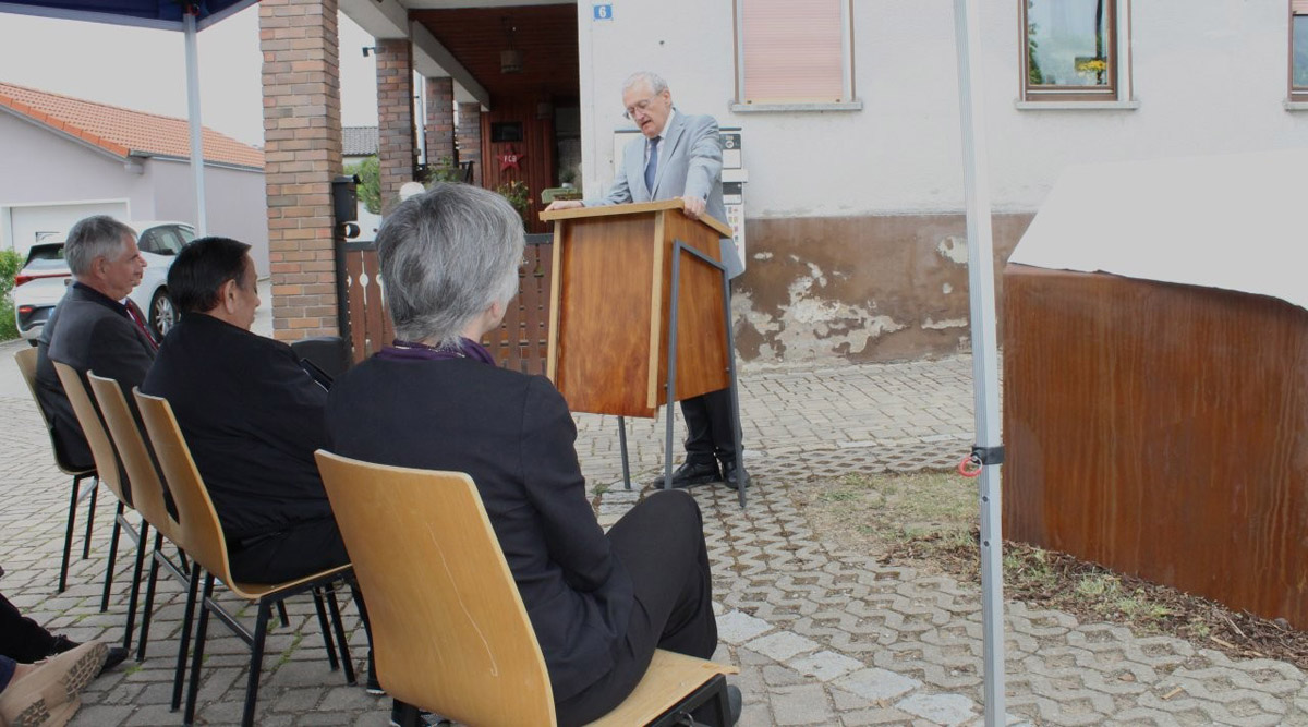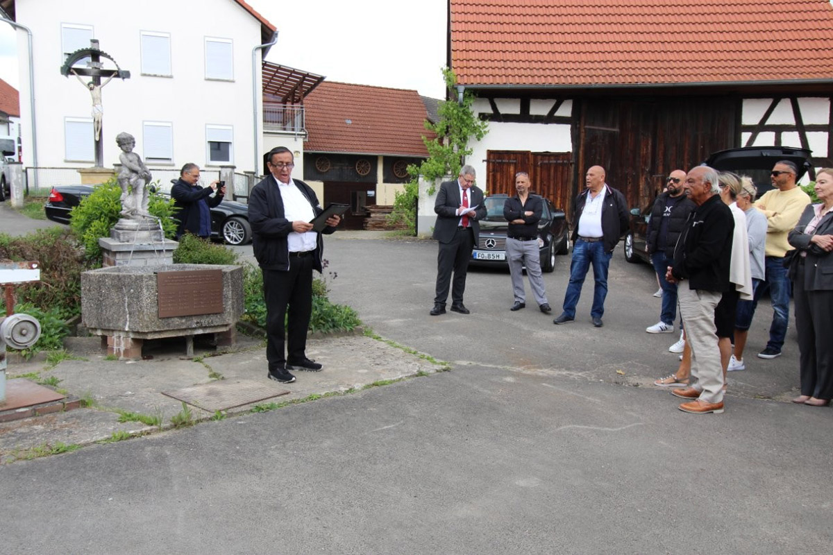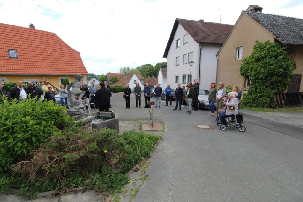 Bürgermeister Hans-Jürgen Scheerbaum widmete in seiner Ansprache diesen Platz als ‚Ort des Erinnern‘, für die, die im Alltag hier vorbeigehen, stehen bleiben, Wasser schöpfen und ins Gespräch kommen. Erinnert werde an die Familie Braun, deren Leben von hier aus gewaltsam unterbrochen wurde. Das Gemeindeoberhaupt sieht es als starkes Zeichen, „dass die Nachkommen heute hier mit uns stehen“. Es sei ein Zeichen für das Weiterleben, für die Verbundenheit mit diesem Ort und der Würde, die bleibt. Die Tafel sei kein große Denkmal, doch sie erinnert daran, dass auch in Höfenneusig Sinti lebten, Menschen, die verfolgt wurden, aber nicht vergessen werden. Allen Beteiligten, die dafür gesorgt hätten, dass die Geschichte der Familie Braun einen Platz im öffentlichen Raum und in den Herzen bekommt, sprach er seinen Dank aus.