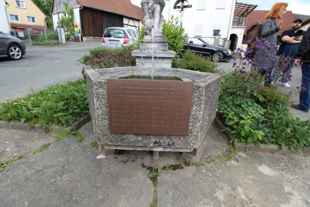 Betroffen und andächtig bildete sich ein Kreis um den Ortsbrunnen von Höfenneusig, vor dem Anwesen Nr. 10, als der Vorsitzende des VDSR Bayern, Erich Schneeberger, das Wort an die Umstehenden richtete. Jetzt waren auch Nachkommen der Sinti-Familie Braun mit anwesend, deren Namen auf einer Bronzeplatte am Brunnenbecken eingegossen waren.