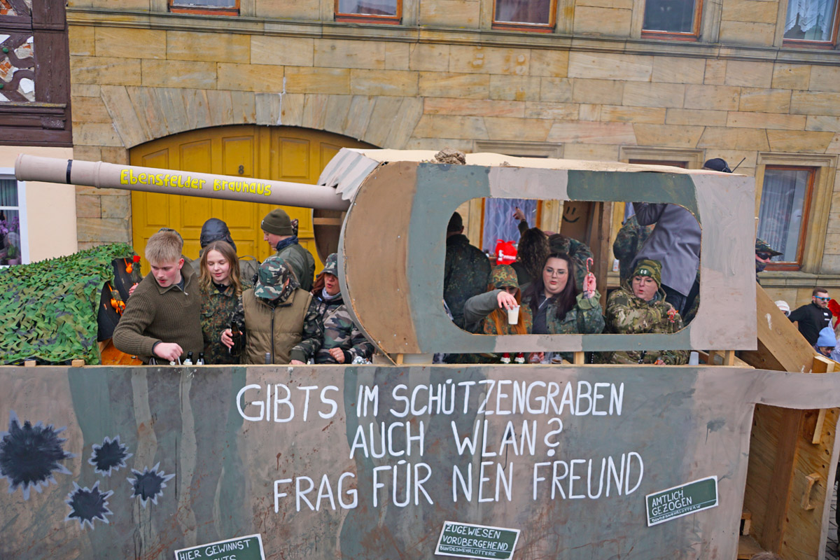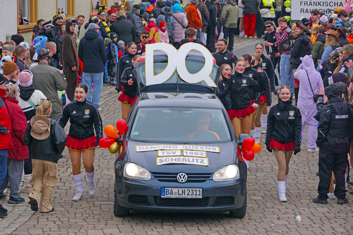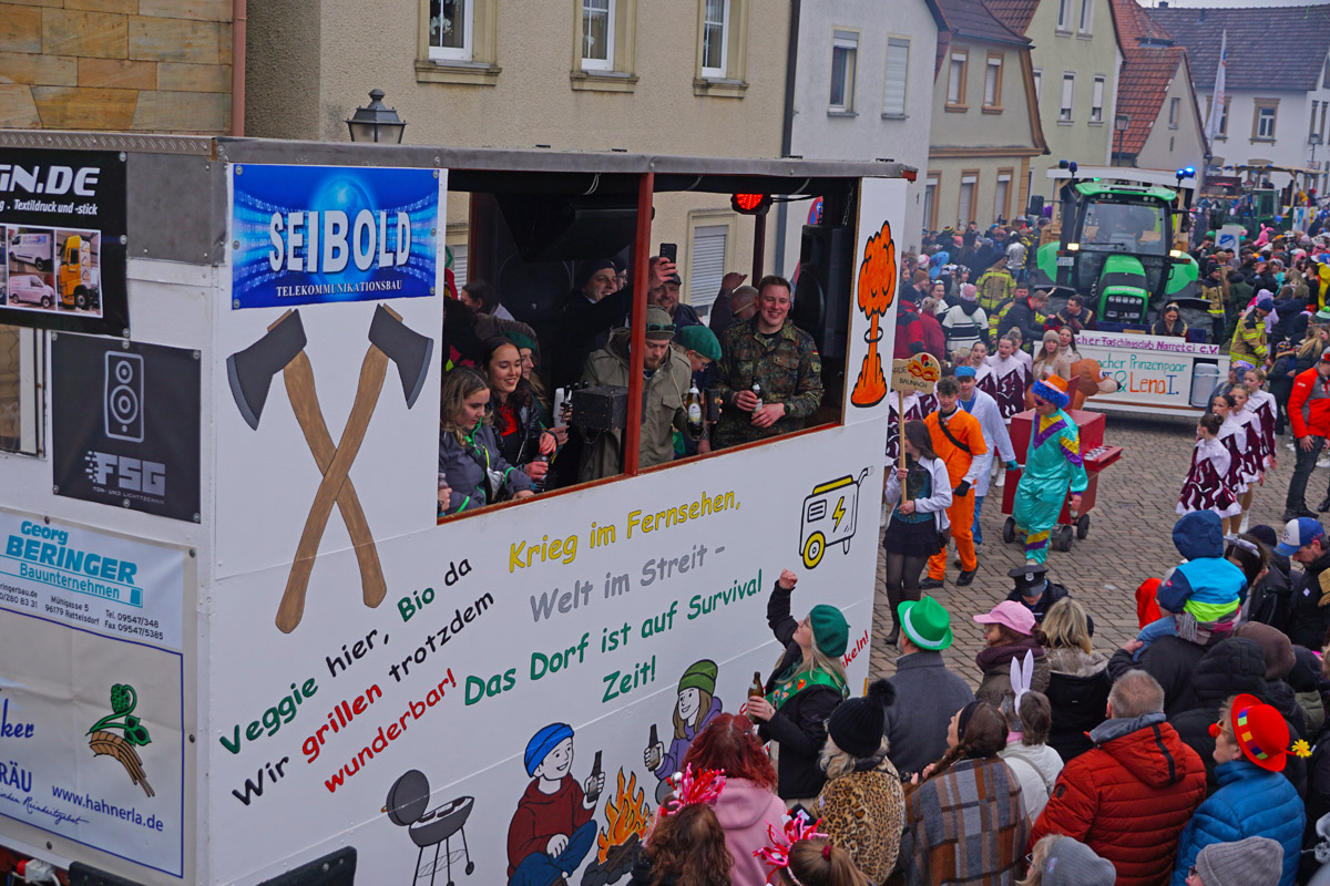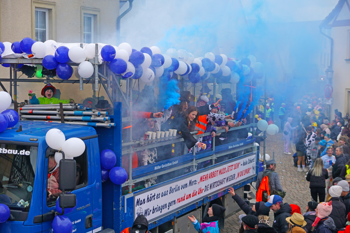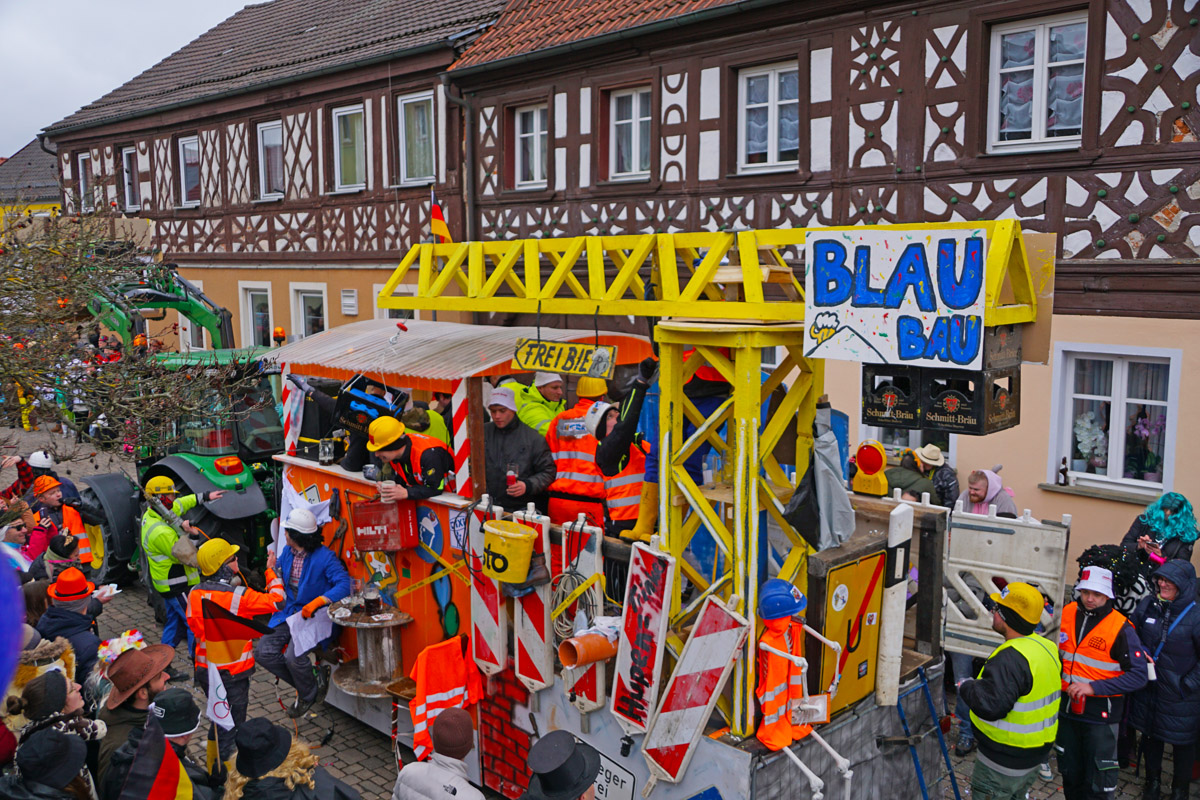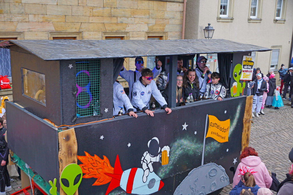 Tänze und kleine Showeinlagen gab es von der Prinzengarde Baunach, der Tanzsportabteilung der SpVgg Rattelsdorf, der Gardetruppe „Dancing Queens“ aus Scheßlitz und der Tanzsportabteilung des SV Waizendorf zu sehen. Ein lokales Thema hatte der Rattelsdorfer Foßernachtsstammtisch mitgebracht: Hier ging es um die zahlreichen Baustellen, die im ganzen Markt im vergangenen Jahr auf Trab hielten, insbesondere durch den Glasfaserausbau. In blauen Nebel tauchte Gerüstbau Müller den ganzen Marktplatz. Und einige Themen wie Werner Beinhart, Wilder Westen oder die Reformen in Sachen Wehrdienst tauchten gleich mehrfach auf den Faschingswagen auf.