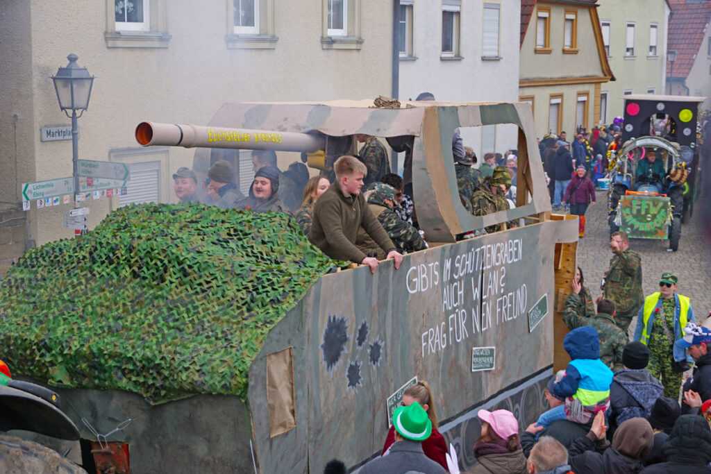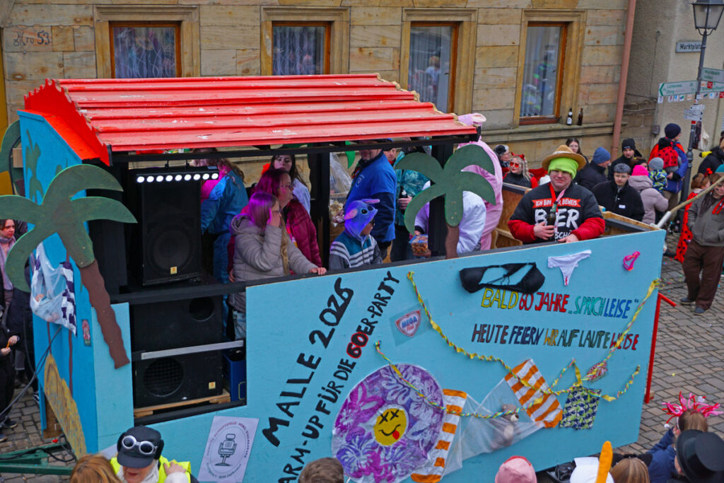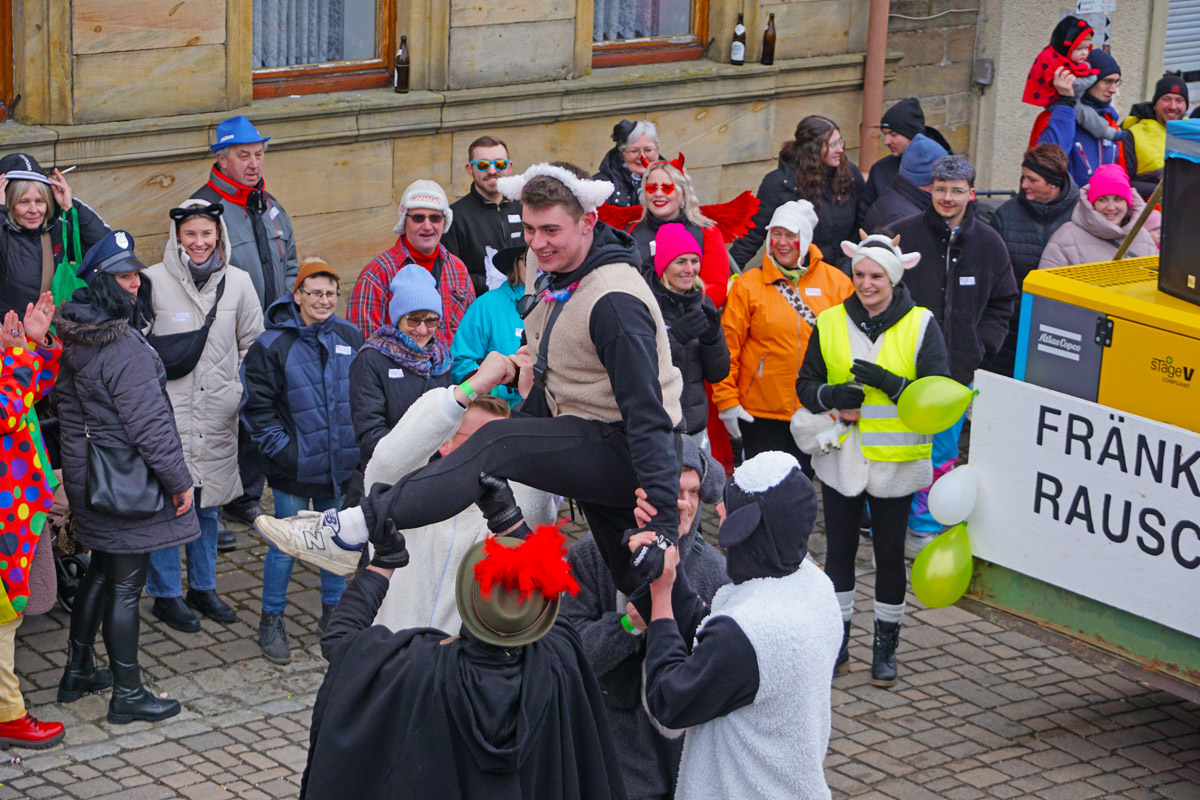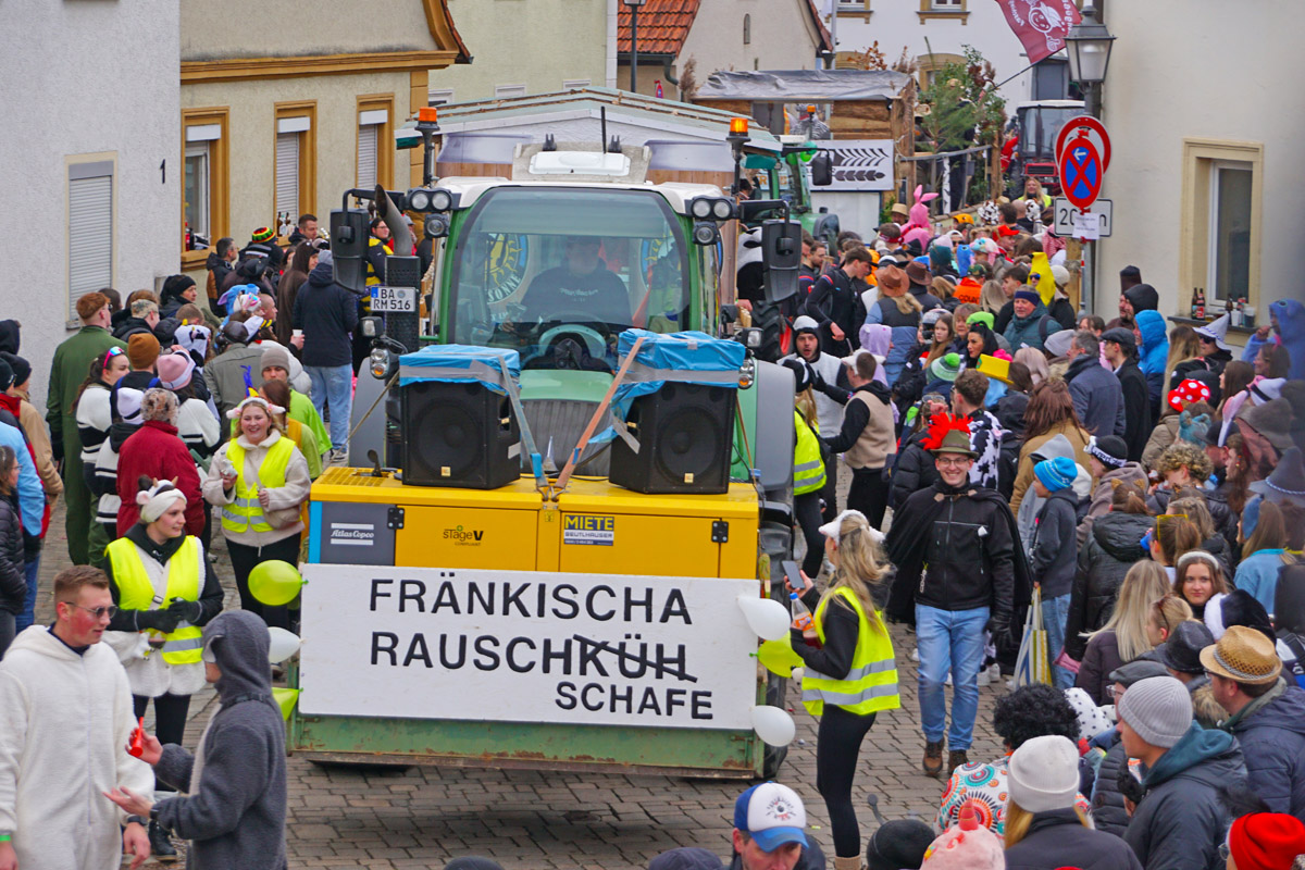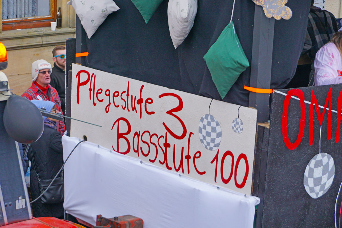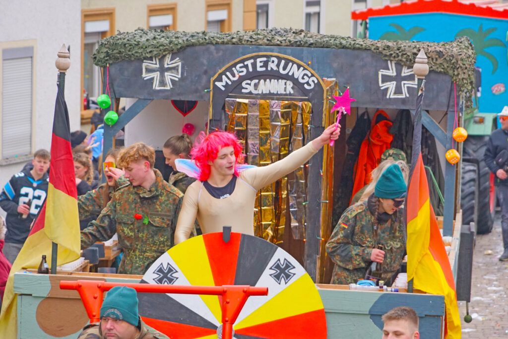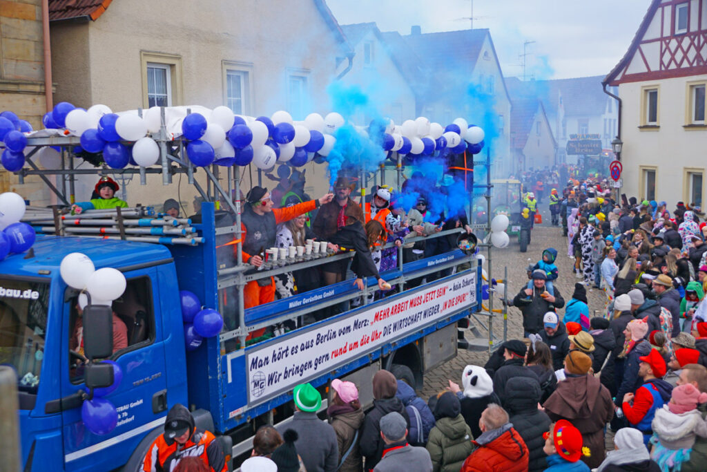 Tänze und kleine Showeinlagen gab es von der Prinzengarde Baunach, der Tanzsportabteilung der SpVgg Rattelsdorf, der Gardetruppe „Dancing Queens“ aus Scheßlitz und der Tanzsportabteilung des SV Waizendorf zu sehen. Ein lokales Thema hatte der Rattelsdorfer Foßernachtsstammtisch mitgebracht: Hier ging es um die zahlreichen Baustellen, die im ganzen Markt im vergangenen Jahr auf Trab hielten, insbesondere durch den Glasfaserausbau. In blauen Nebel tauchte Gerüstbau Müller den ganzen Marktplatz. Und einige Themen wie Werner Beinhart, Wilder Westen oder die Reformen in Sachen Wehrdienst tauchten gleich mehrfach auf den Faschingswagen auf.