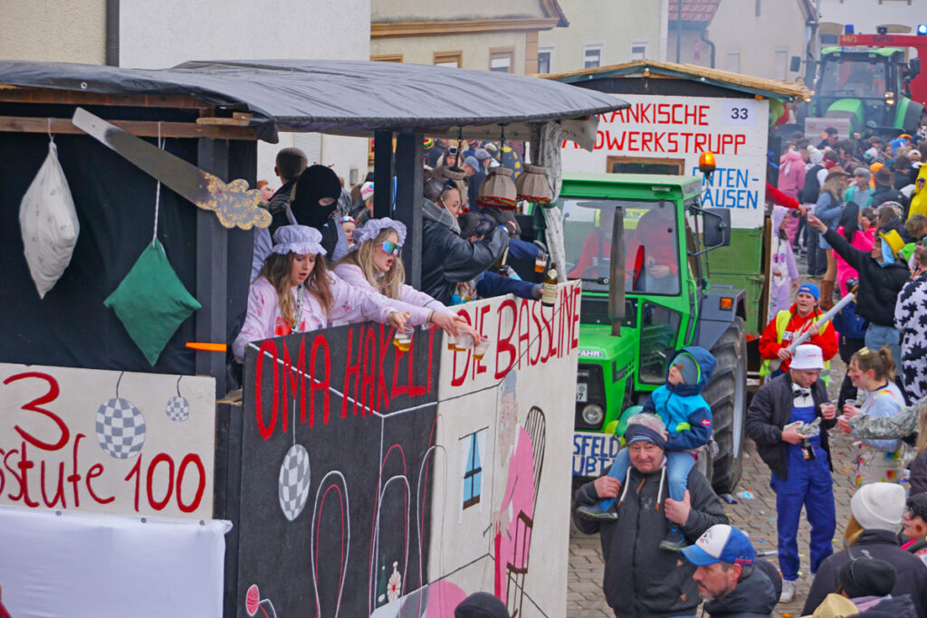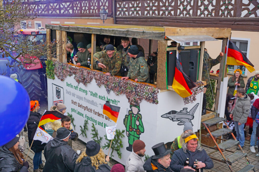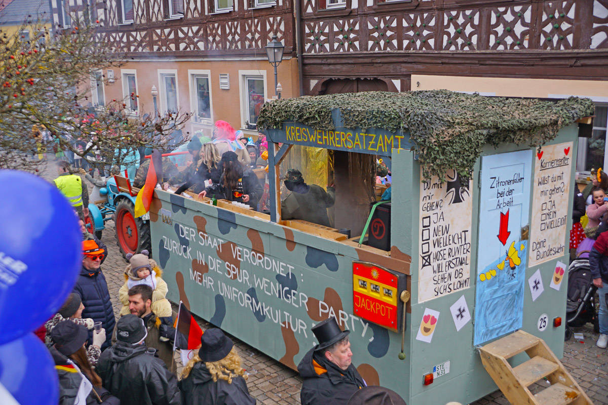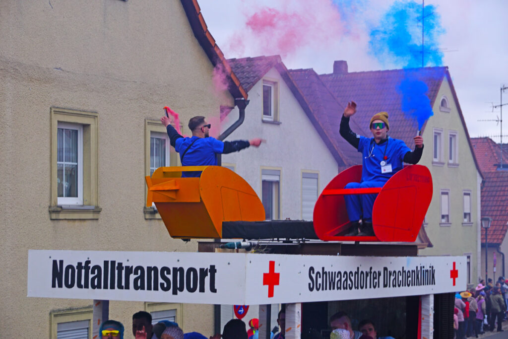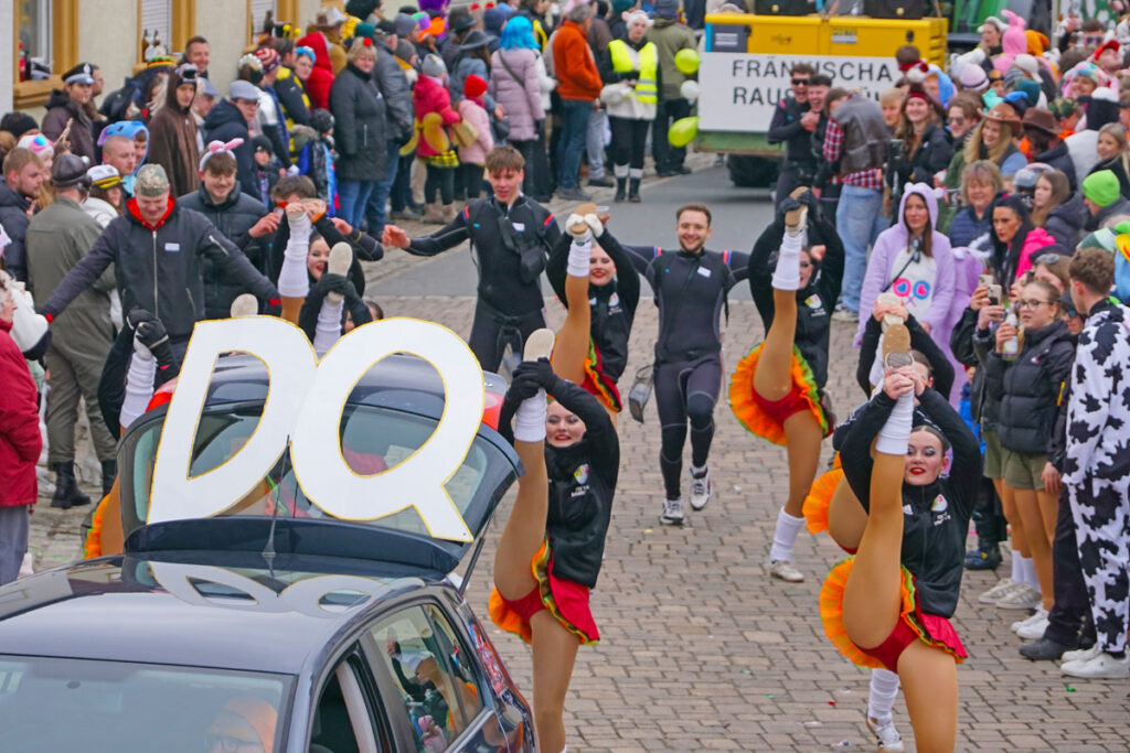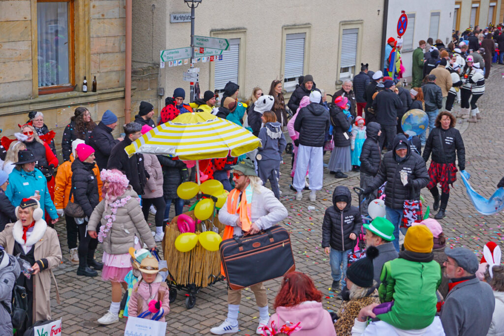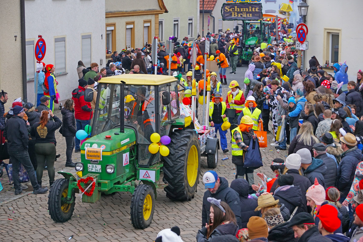 Tänze und kleine Showeinlagen gab es von der Prinzengarde Baunach, der Tanzsportabteilung der SpVgg Rattelsdorf, der Gardetruppe „Dancing Queens“ aus Scheßlitz und der Tanzsportabteilung des SV Waizendorf zu sehen. Ein lokales Thema hatte der Rattelsdorfer Foßernachtsstammtisch mitgebracht: Hier ging es um die zahlreichen Baustellen, die im ganzen Markt im vergangenen Jahr auf Trab hielten, insbesondere durch den Glasfaserausbau. In blauen Nebel tauchte Gerüstbau Müller den ganzen Marktplatz. Und einige Themen wie Werner Beinhart, Wilder Westen oder die Reformen in Sachen Wehrdienst tauchten gleich mehrfach auf den Faschingswagen auf.