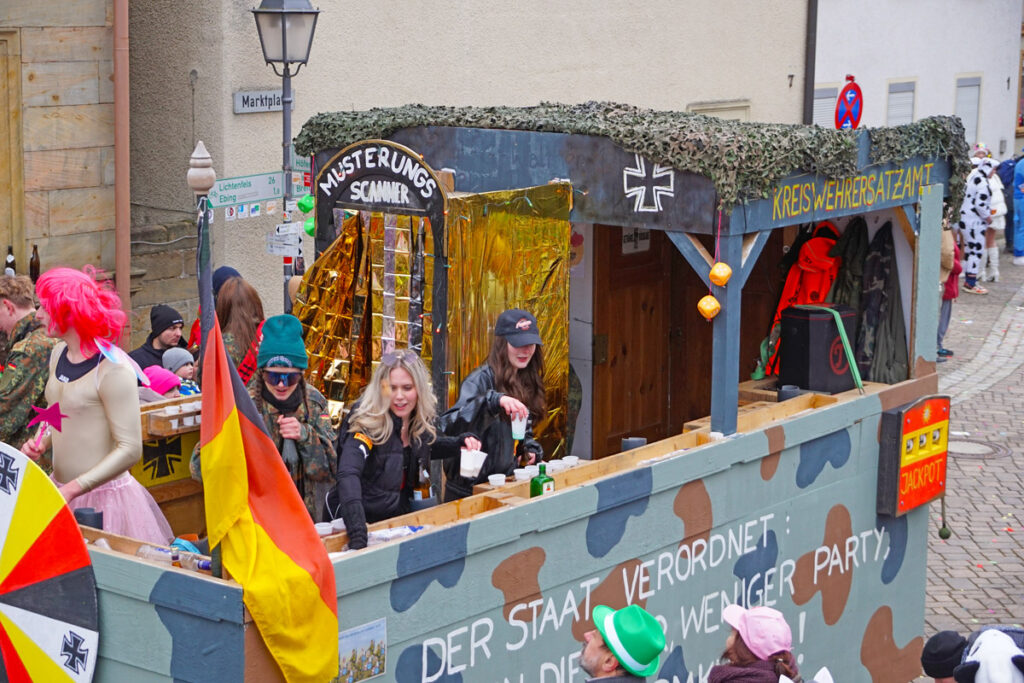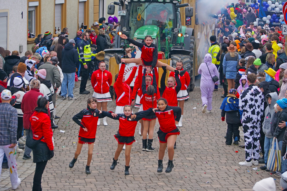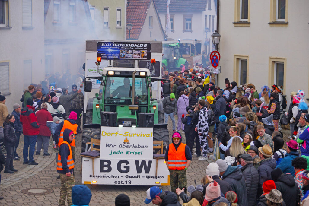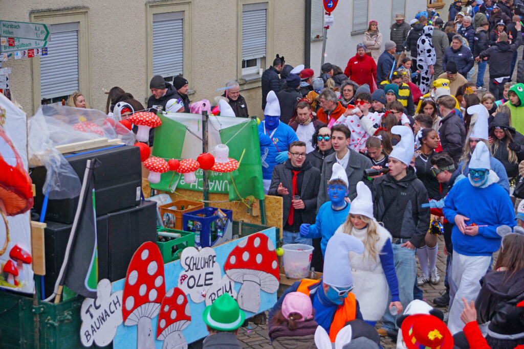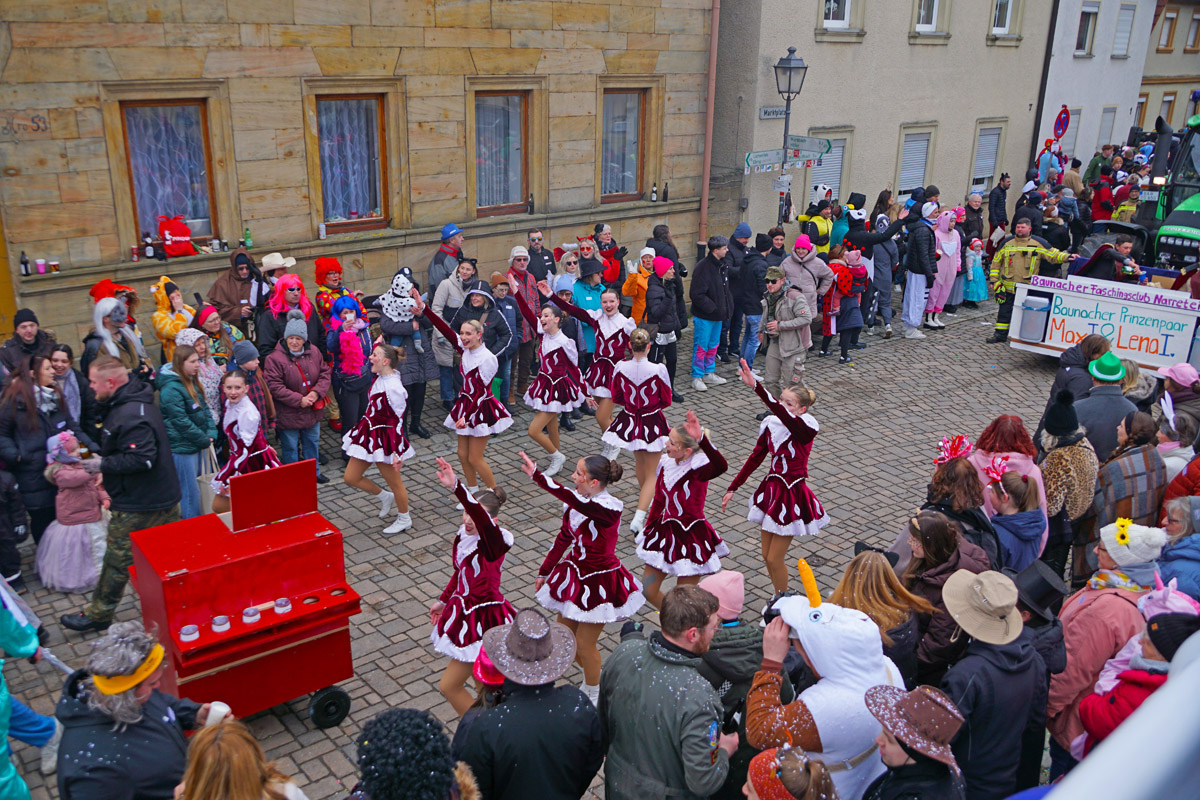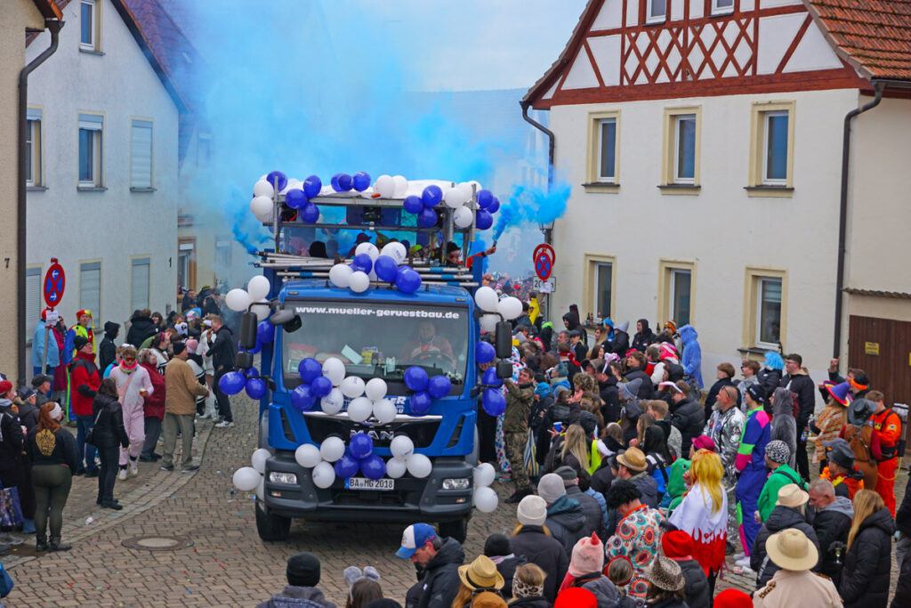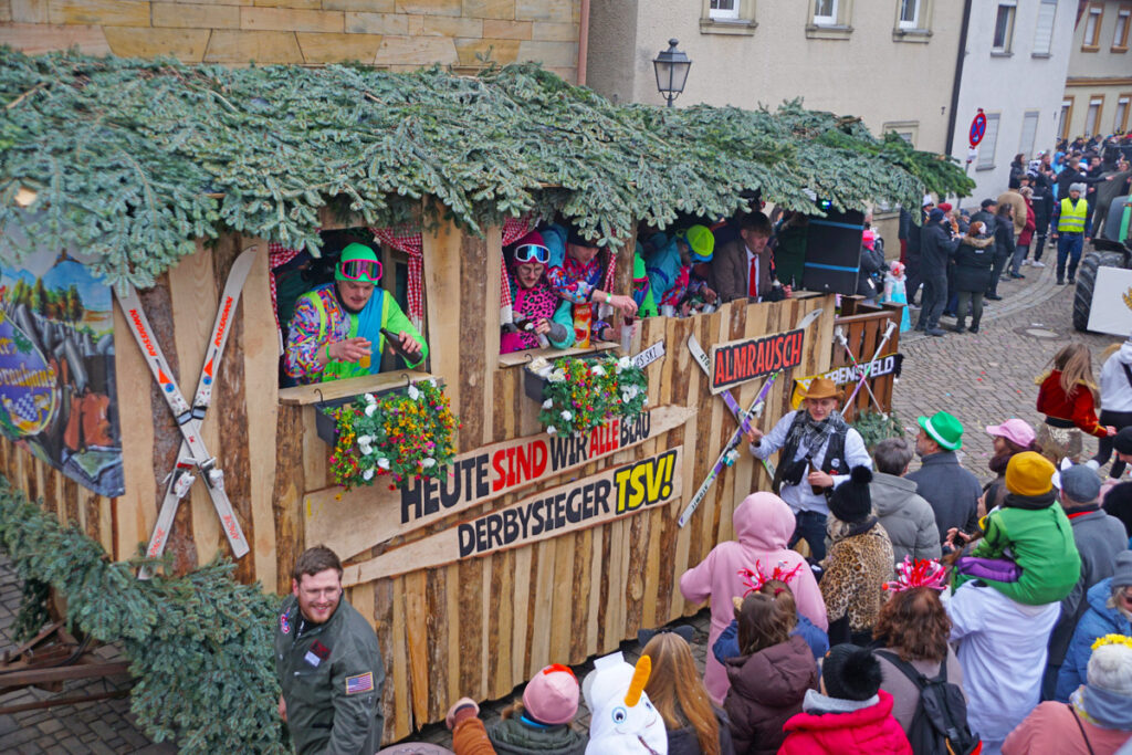 Tänze und kleine Showeinlagen gab es von der Prinzengarde Baunach, der Tanzsportabteilung der SpVgg Rattelsdorf, der Gardetruppe „Dancing Queens“ aus Scheßlitz und der Tanzsportabteilung des SV Waizendorf zu sehen. Ein lokales Thema hatte der Rattelsdorfer Foßernachtsstammtisch mitgebracht: Hier ging es um die zahlreichen Baustellen, die im ganzen Markt im vergangenen Jahr auf Trab hielten, insbesondere durch den Glasfaserausbau. In blauen Nebel tauchte Gerüstbau Müller den ganzen Marktplatz. Und einige Themen wie Werner Beinhart, Wilder Westen oder die Reformen in Sachen Wehrdienst tauchten gleich mehrfach auf den Faschingswagen auf.
