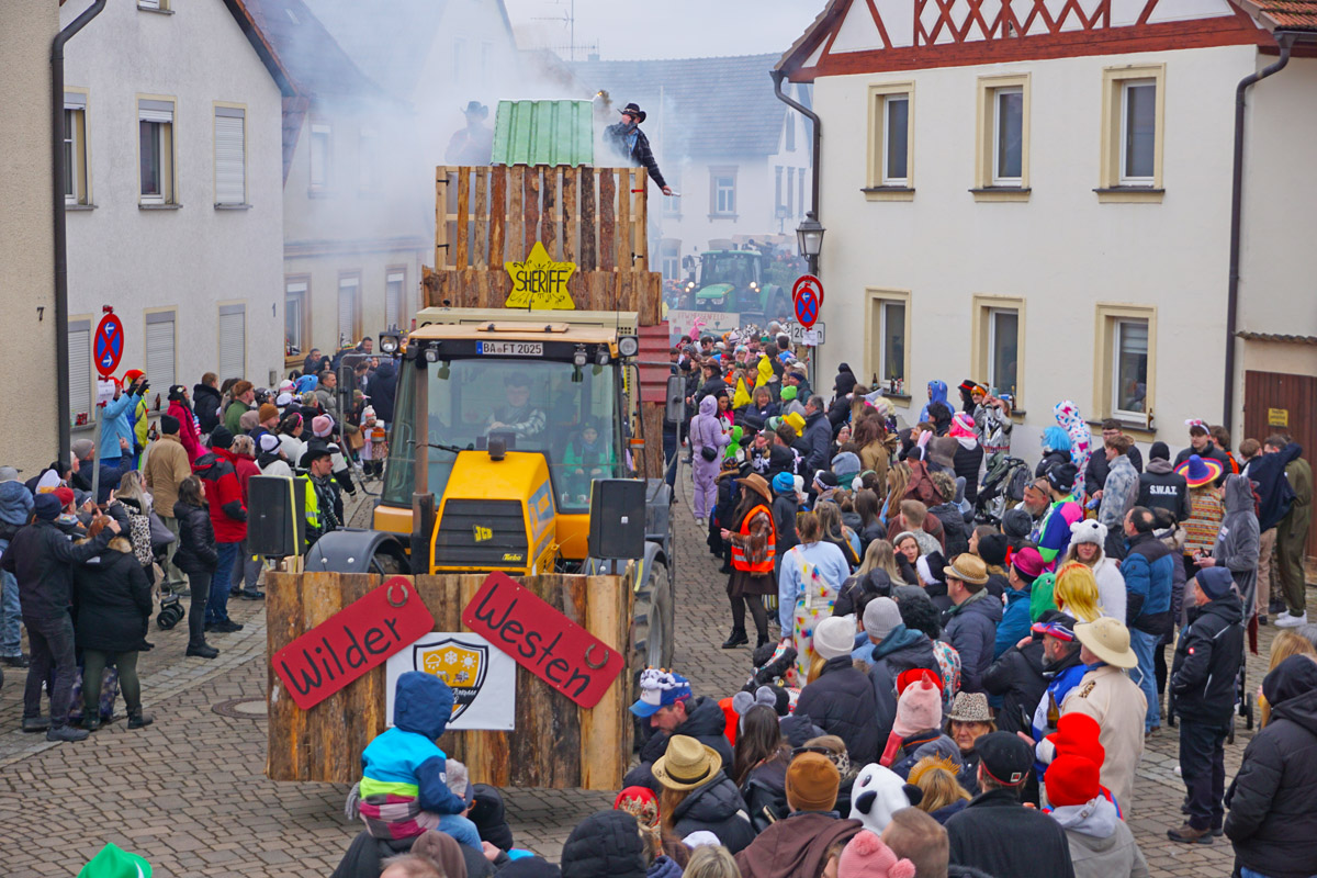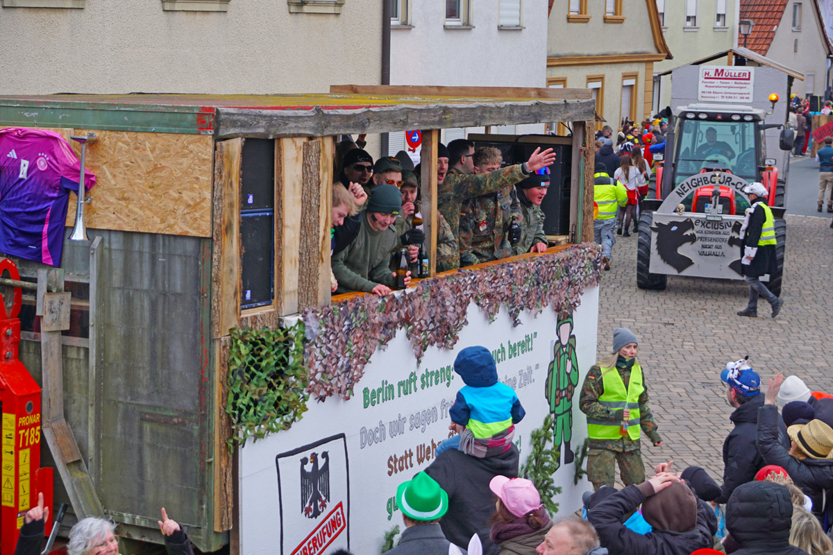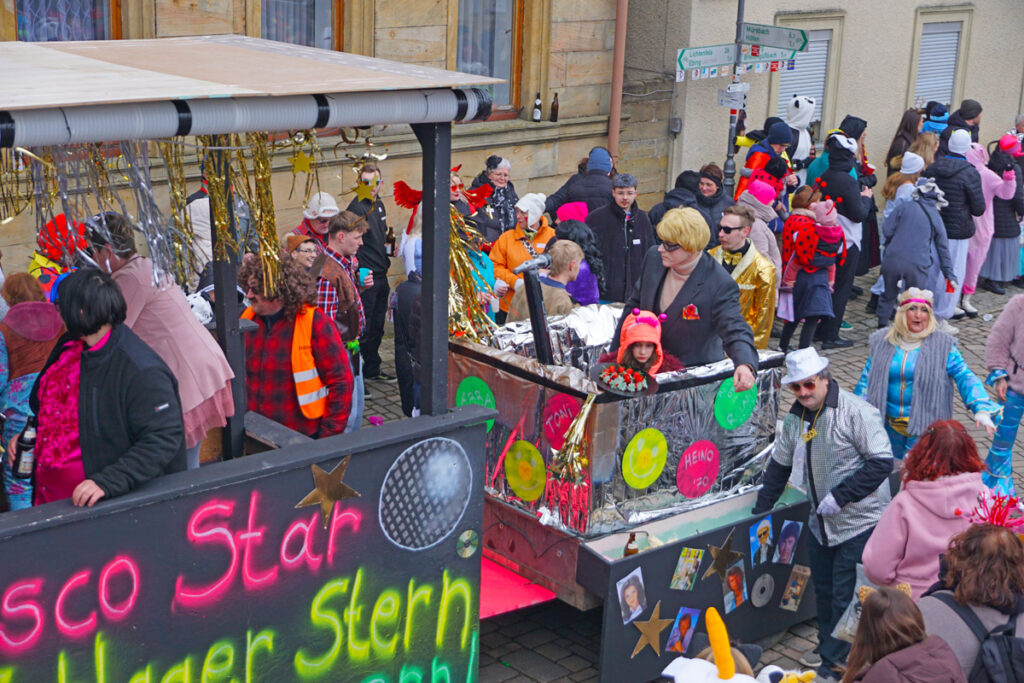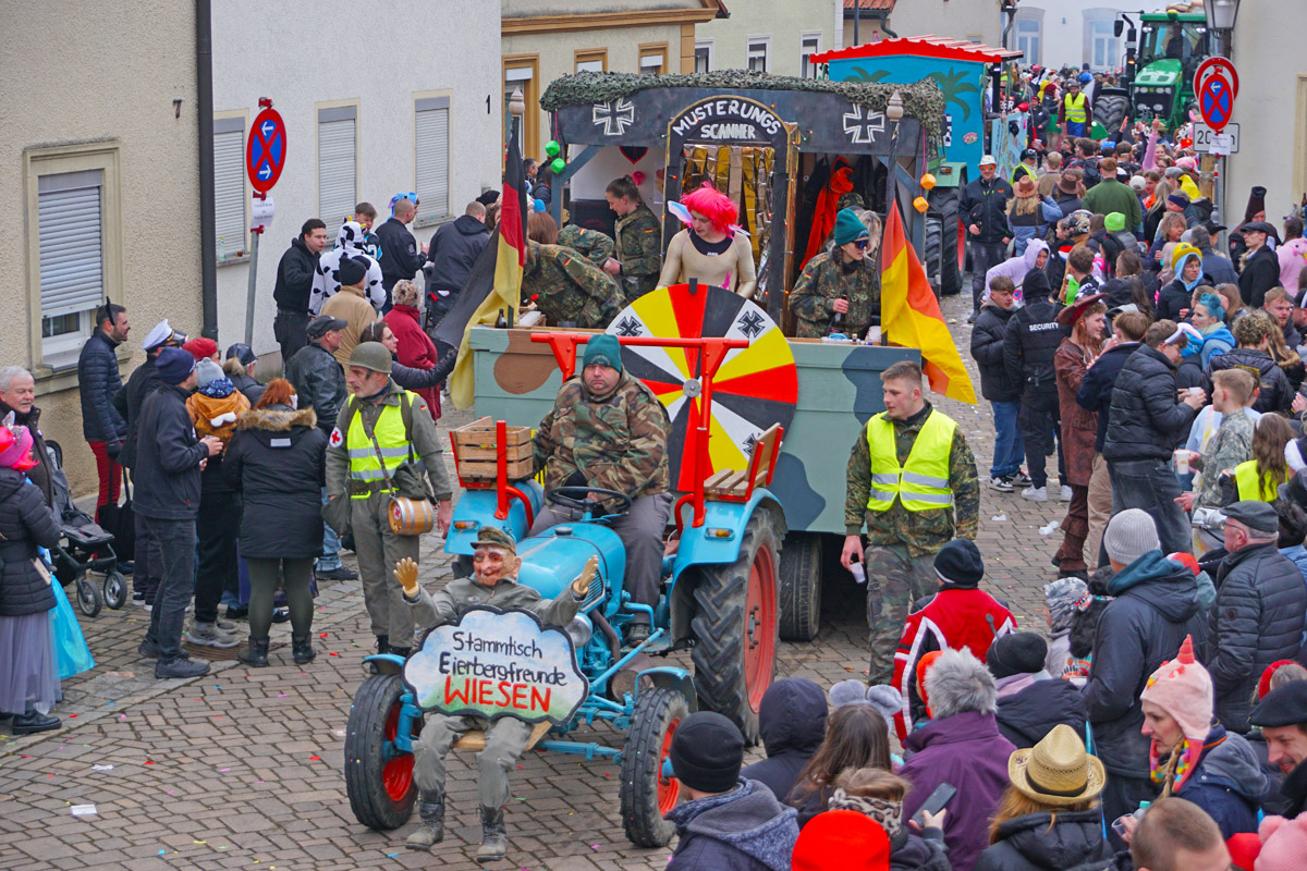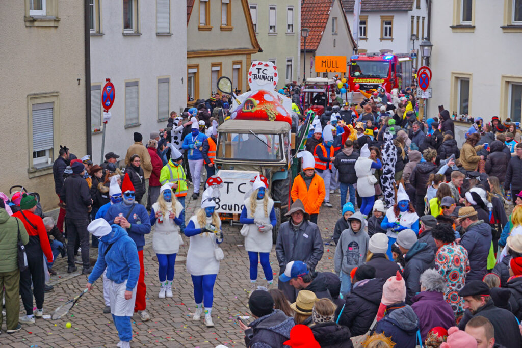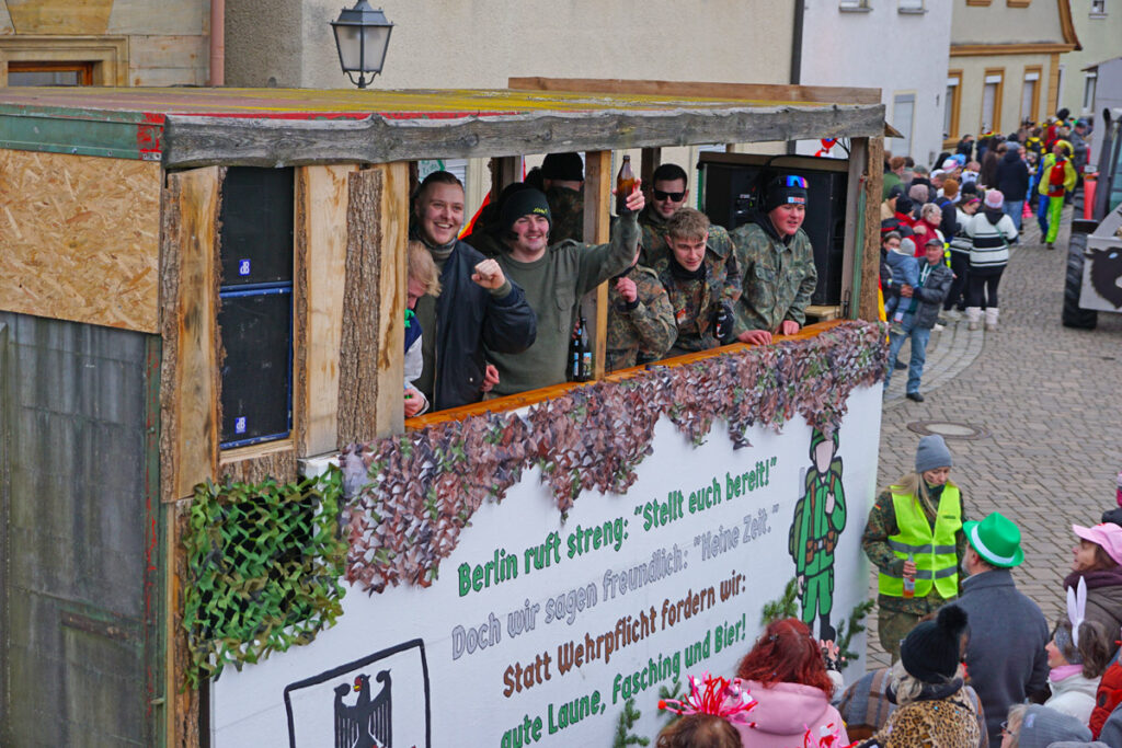 Tänze und kleine Showeinlagen gab es von der Prinzengarde Baunach, der Tanzsportabteilung der SpVgg Rattelsdorf, der Gardetruppe „Dancing Queens“ aus Scheßlitz und der Tanzsportabteilung des SV Waizendorf zu sehen. Ein lokales Thema hatte der Rattelsdorfer Foßernachtsstammtisch mitgebracht: Hier ging es um die zahlreichen Baustellen, die im ganzen Markt im vergangenen Jahr auf Trab hielten, insbesondere durch den Glasfaserausbau. In blauen Nebel tauchte Gerüstbau Müller den ganzen Marktplatz. Und einige Themen wie Werner Beinhart, Wilder Westen oder die Reformen in Sachen Wehrdienst tauchten gleich mehrfach auf den Faschingswagen auf.