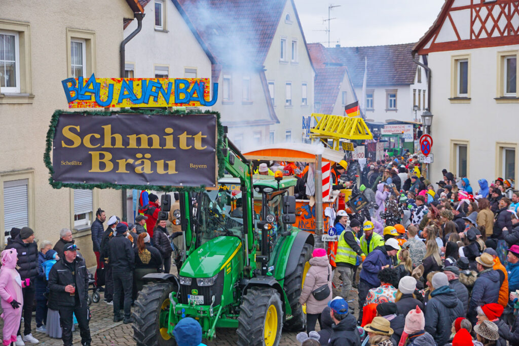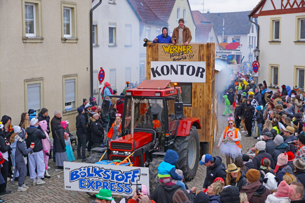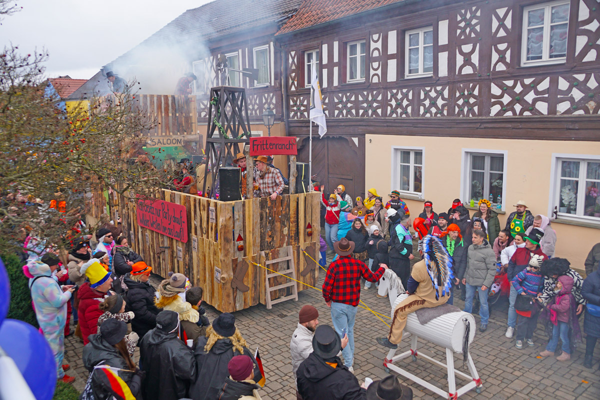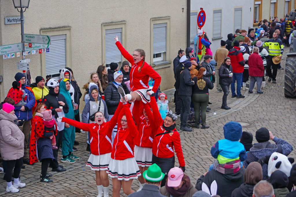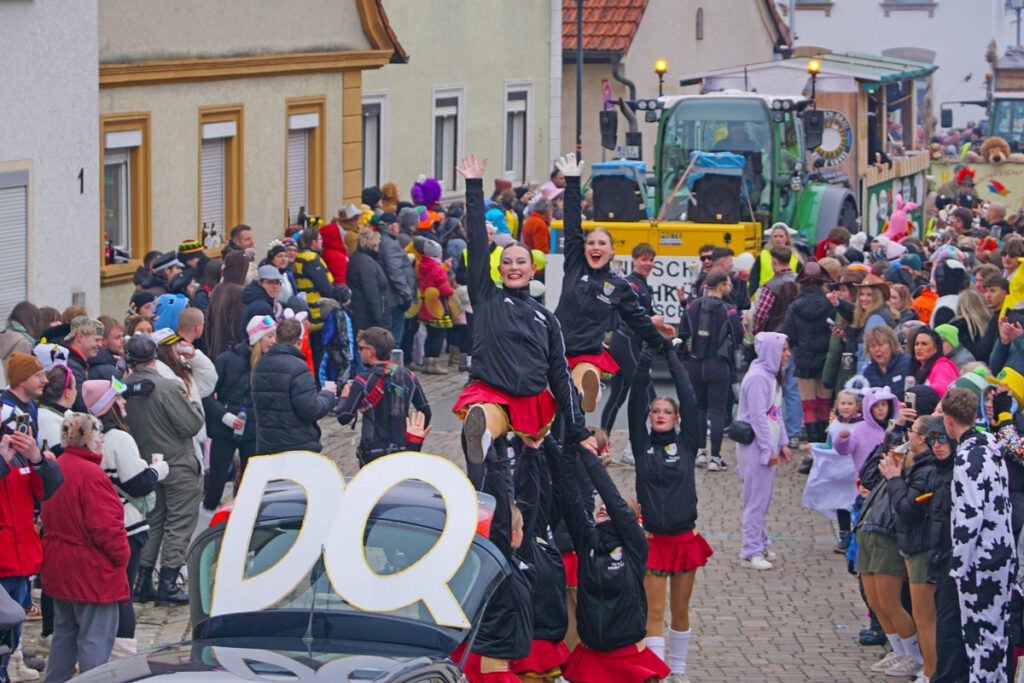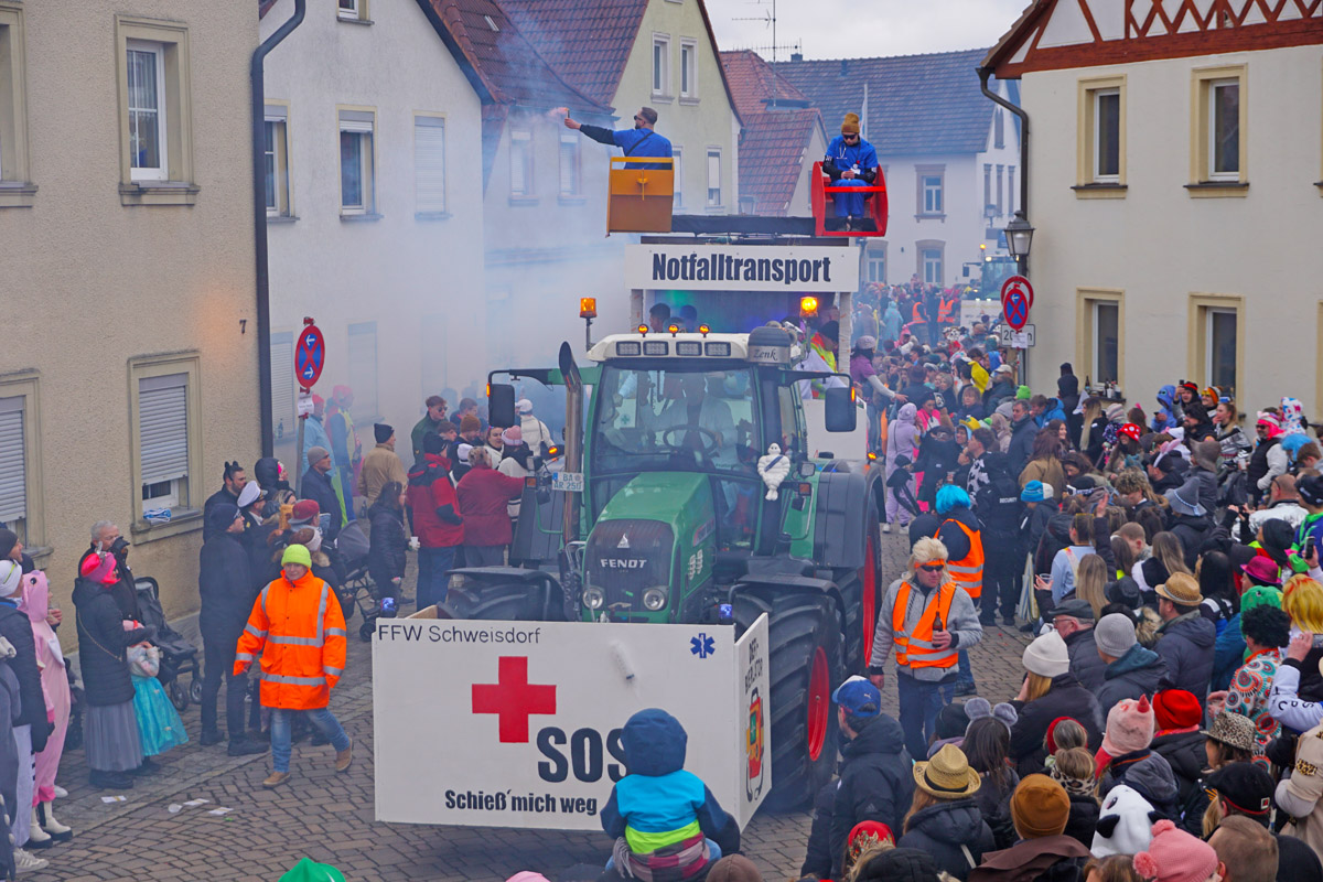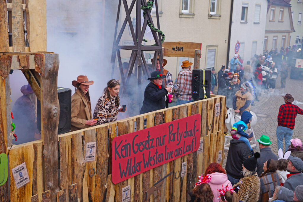 Tänze und kleine Showeinlagen gab es von der Prinzengarde Baunach, der Tanzsportabteilung der SpVgg Rattelsdorf, der Gardetruppe „Dancing Queens“ aus Scheßlitz und der Tanzsportabteilung des SV Waizendorf zu sehen. Ein lokales Thema hatte der Rattelsdorfer Foßernachtsstammtisch mitgebracht: Hier ging es um die zahlreichen Baustellen, die im ganzen Markt im vergangenen Jahr auf Trab hielten, insbesondere durch den Glasfaserausbau. In blauen Nebel tauchte Gerüstbau Müller den ganzen Marktplatz. Und einige Themen wie Werner Beinhart, Wilder Westen oder die Reformen in Sachen Wehrdienst tauchten gleich mehrfach auf den Faschingswagen auf.